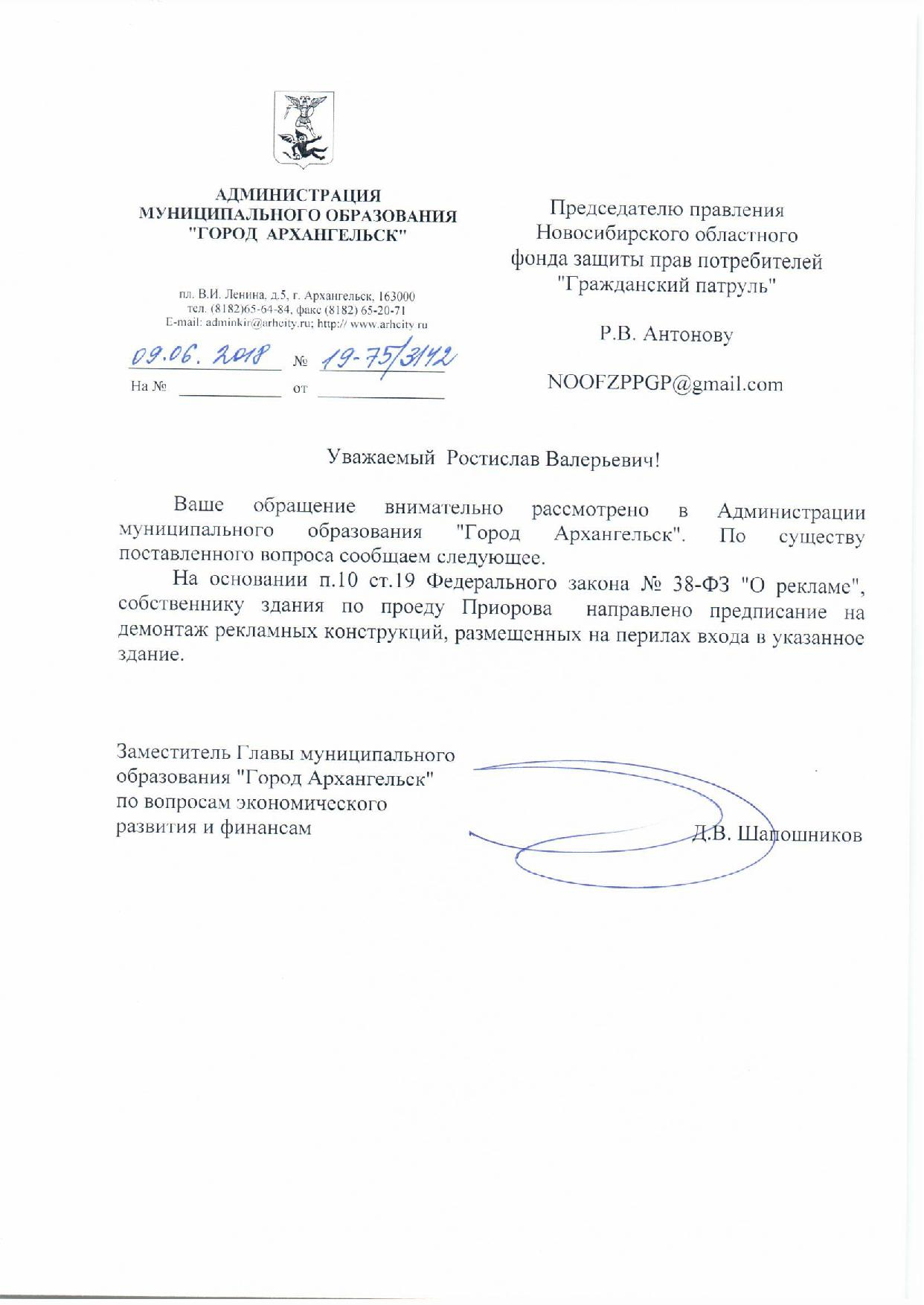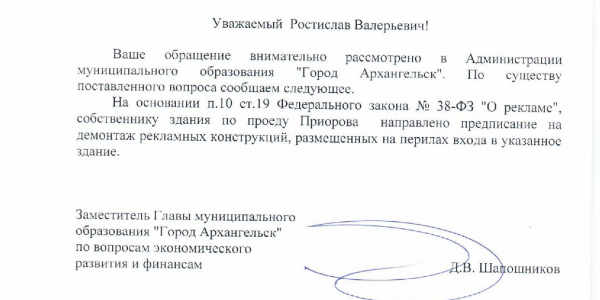Номер жалобы:34969 Тип жалобы:Прочее Название объекта:Администрация Город:Архангельск Адрес:Архангельск, проезд Приорова, 4 Описание жалобы:Несанкционированная реклама на крыльце Статус: