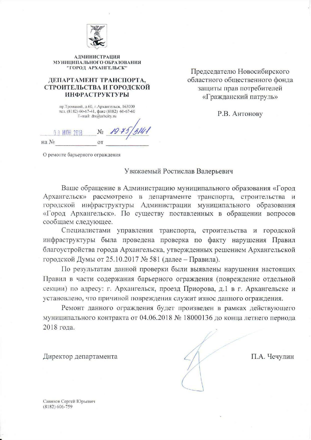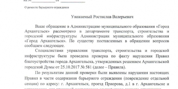 Номер жалобы:34970 Тип жалобы:Прочее Название объекта:Администрация Город:Архангельск Адрес:Архангельск, проезд Приорова, 1 Описание жалобы:Сломанные заборы Статус: