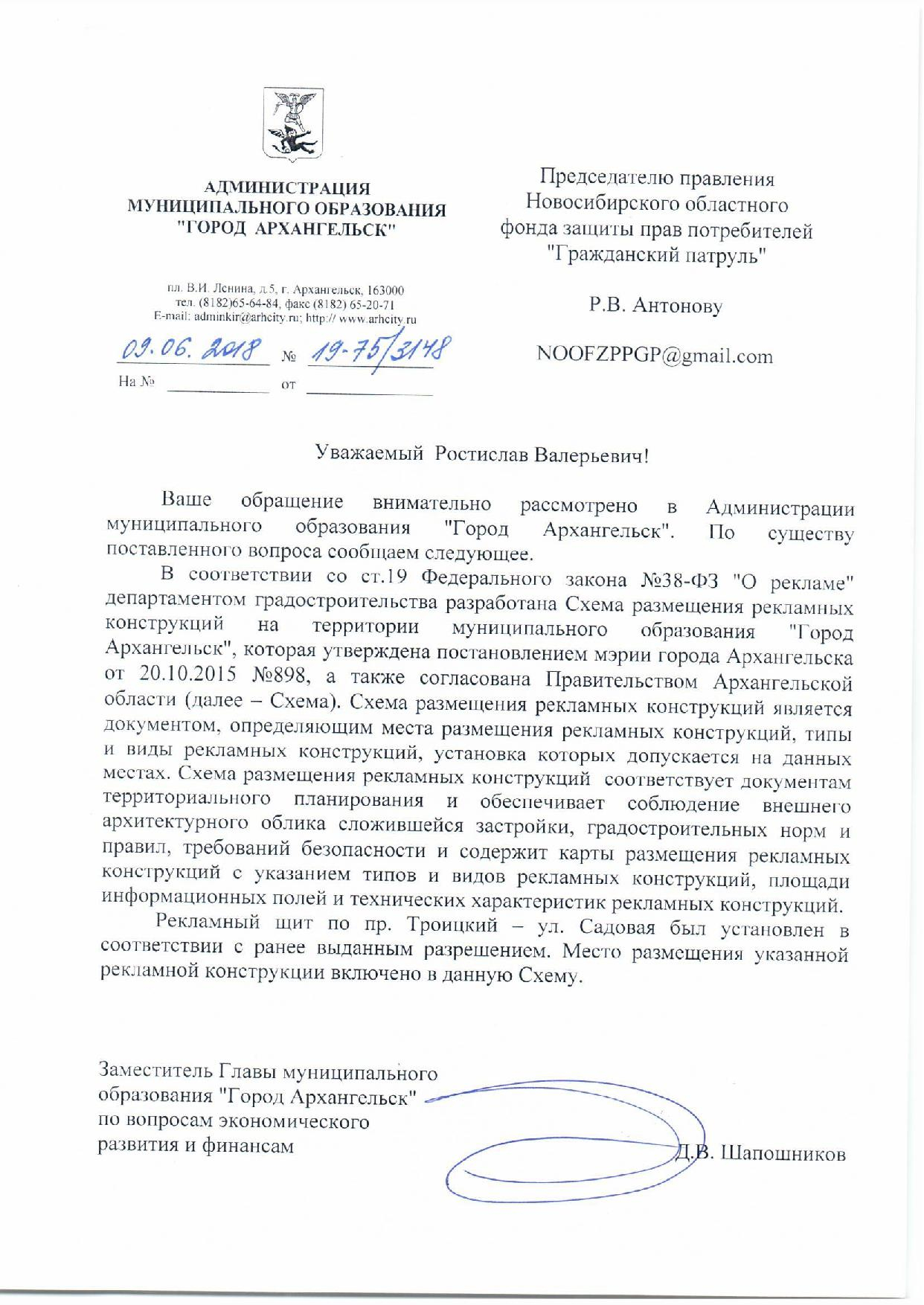 Номер жалобы:34972 Тип жалобы:Прочее Название объекта:Администрация Регион:Архангельская область Город:Архангельск Адрес:ул. Садовая, 9 Описание жалобы:Законна ли эта конструкция с рекламой? Очень портит вид новой рябиновой аллеи. Статус: