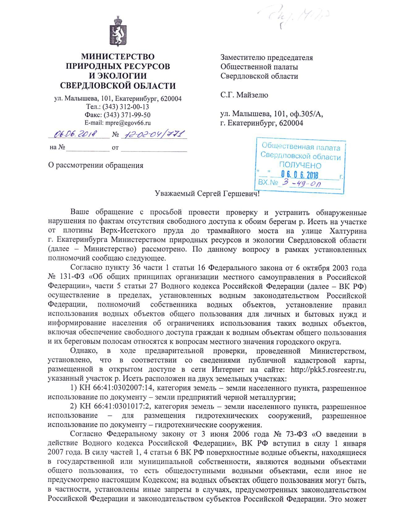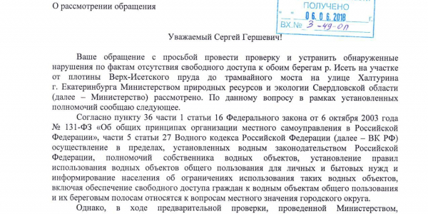Номер жалобы:34973 Тип жалобы:Прочее Название объекта:Министерство природных ресурсов Свердловской области, не администрация Екатеринбурга Регион:Свердловская область Город:Екатеринбург Адрес:улица Кирова, 28А Описание жалобы:Описанное дальше не входит в полномочия администрации Екатеринбурга. В нарушение п. 6 Водного кодекса РФ отсутствует свободный доступ к обоим берегам реки Исети на участке от плотины Верх-Исетского пруда до трамвайного моста по улице Халтурина. Проход вдоль реки перегорожен забором с колючей проволокой. Статус: