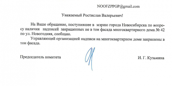 Номер жалобы:34206 Тип жалобы:Иные проблемы ЖКХ Название объекта:Управляющая Компания Регион:Новосибирская область Город:Новосибирск Адрес:ул. Новогодняя, 42 Описание жалобы:Надписи закрашены не в тон Статус: