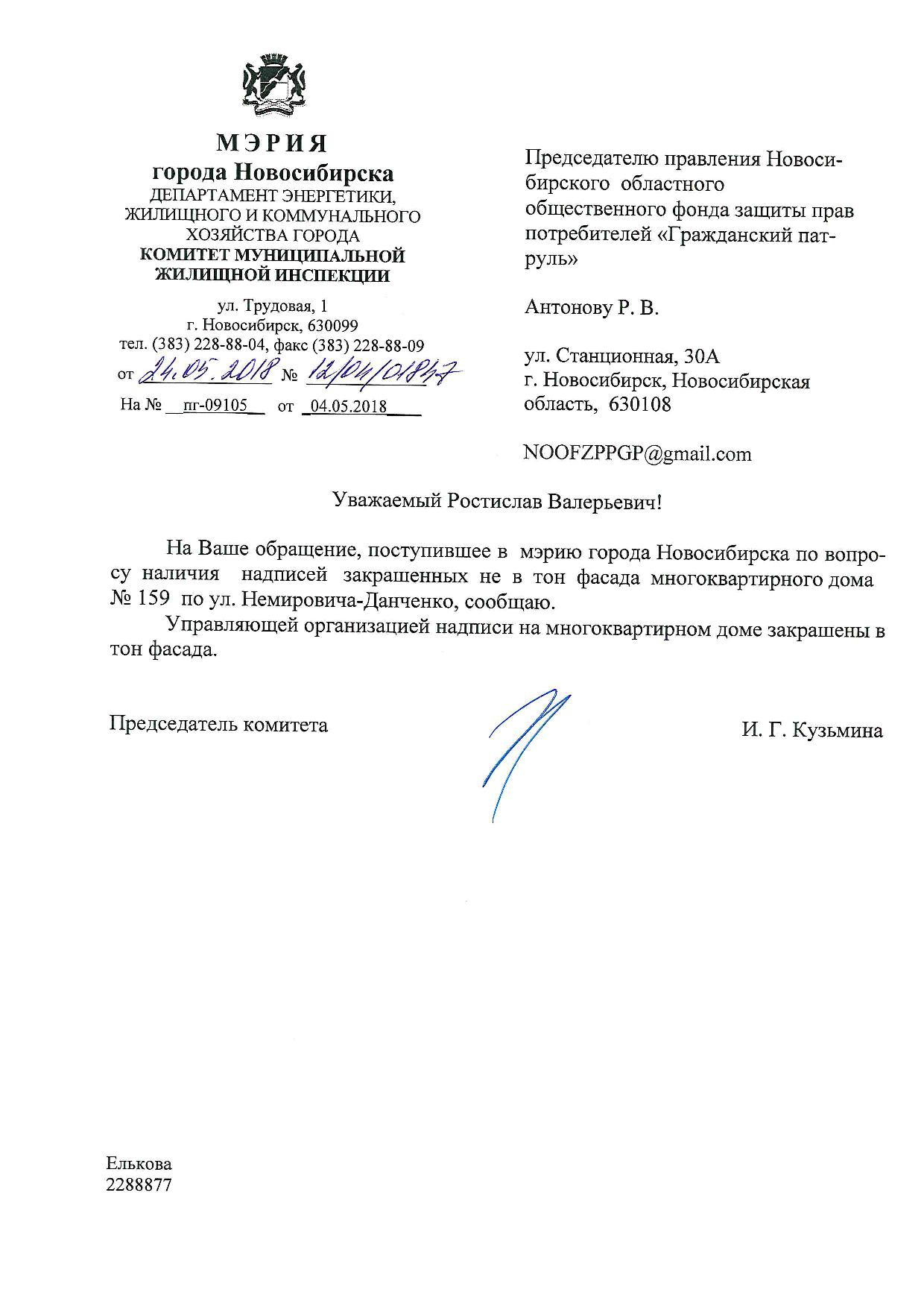 Номер жалобы:34202 Тип жалобы:Иные проблемы ЖКХ Название объекта:Управляющая Компания Регион:Новосибирская область Город:Новосибирск Адрес:ул. Немировича-Данченко, 159 Описание жалобы:Надписи закрашены не в тон Статус: