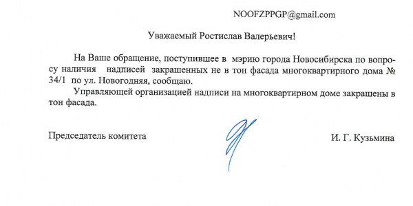 Номер жалобы:34197 Тип жалобы:Иные проблемы ЖКХ Название объекта:Управляющая Компания Регион:Новосибирская область Город:Новосибирск Адрес:ул. Немировича-Данченко, 155/2 Описание жалобы:Надписи закрашены не в тон Статус: