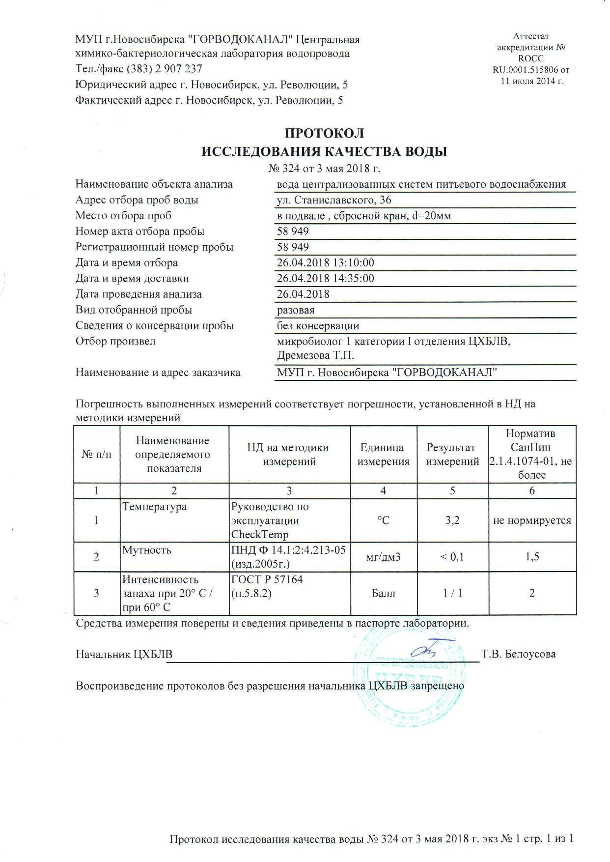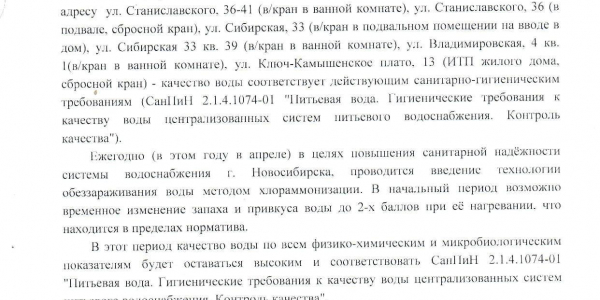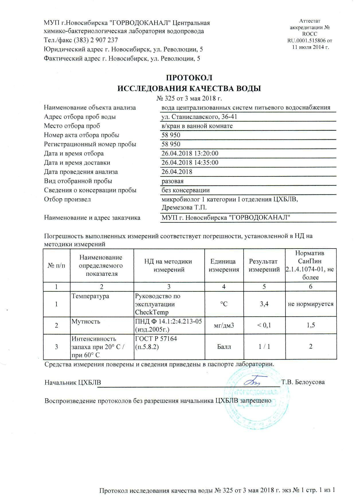 Номер жалобы:33693 Тип жалобы:Прочее Название объекта:Водоканал Регион:Новосибирская область Город:Новосибирск Адрес:ул. Станиславского, 36 Описание жалобы:Вода из под крана пахнет жутко. Запах напоминает что-то нечто болотное, и запах медикаментов прослеживается. Запах от воды как в больнице, Лекарствами. Сомневаюсь, что вода безопасна. Покупаю бутилированную, и кипячу другую.. Статус: