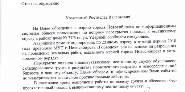 Номер жалобы:33696 Тип жалобы:Прочее Название объекта:Не Установлено Регион:Новосибирская область Город:Новосибирск Адрес:Ударная ул., 27/3 Описание жалобы:По жалобе 31688 был ответ. Вот как обстоят дела на сей момент. Нарушение не только усугубилось, но их стало больше. Мало того что место ведения земляных работ не обозначено и нет ограждения, как и паспорта объекта. Опасные остатки ограждения (забора) лежат на пешеходной части, и мешают парковке автомобилей. Техники никакой нет. Статус: