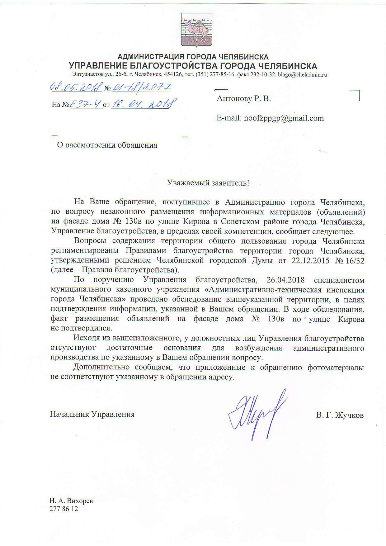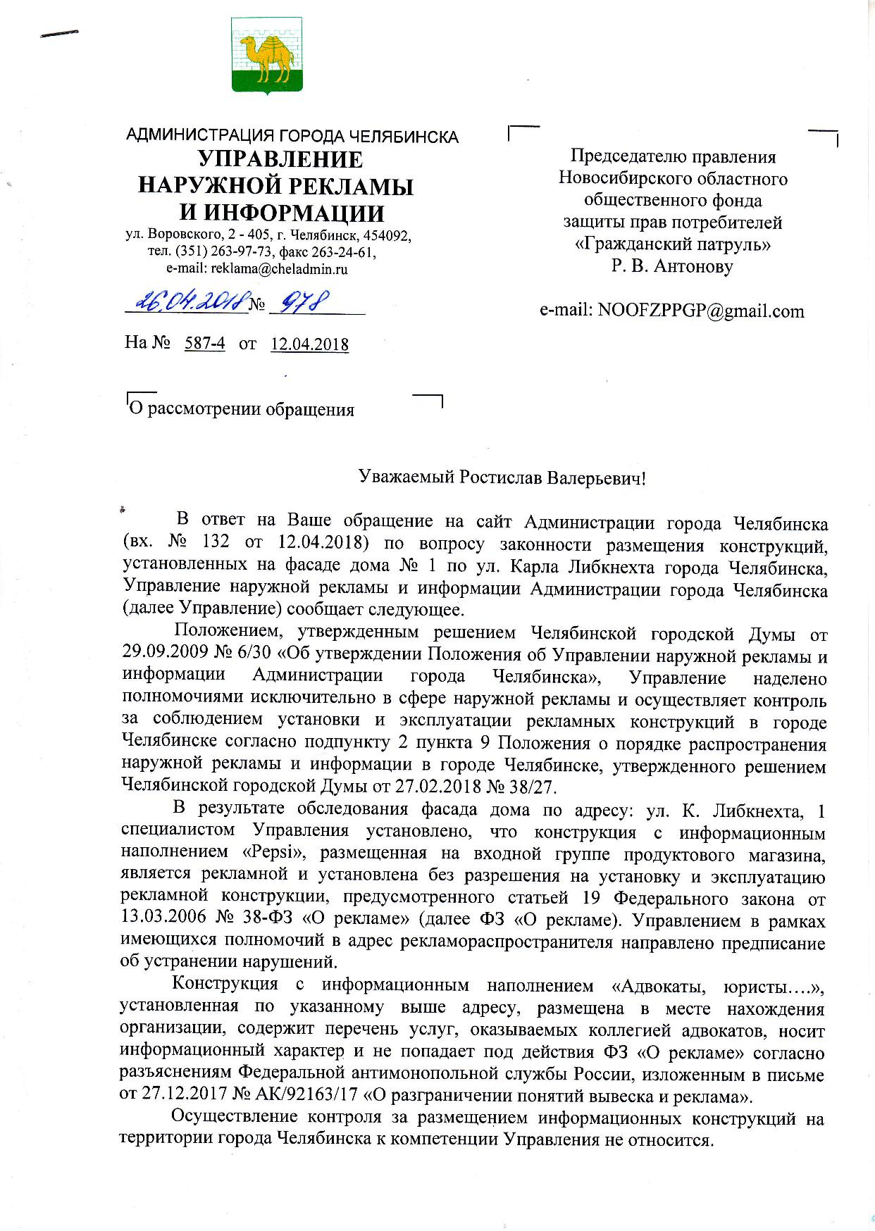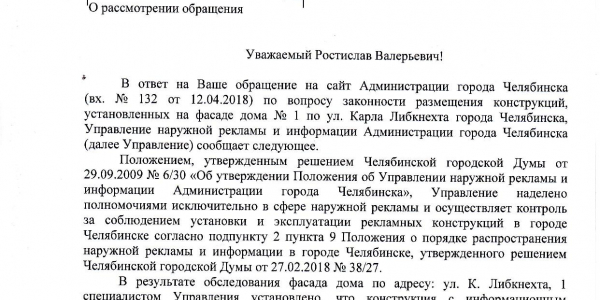 Номер жалобы:33281 Тип жалобы:Прочее Название объекта:Администрация Регион:Челябинская область Город:Челябинск Адрес:ул. Карла Либкнехта, 1 Описание жалобы:Реклама на фасаде дома портит внешний вид Статус:
