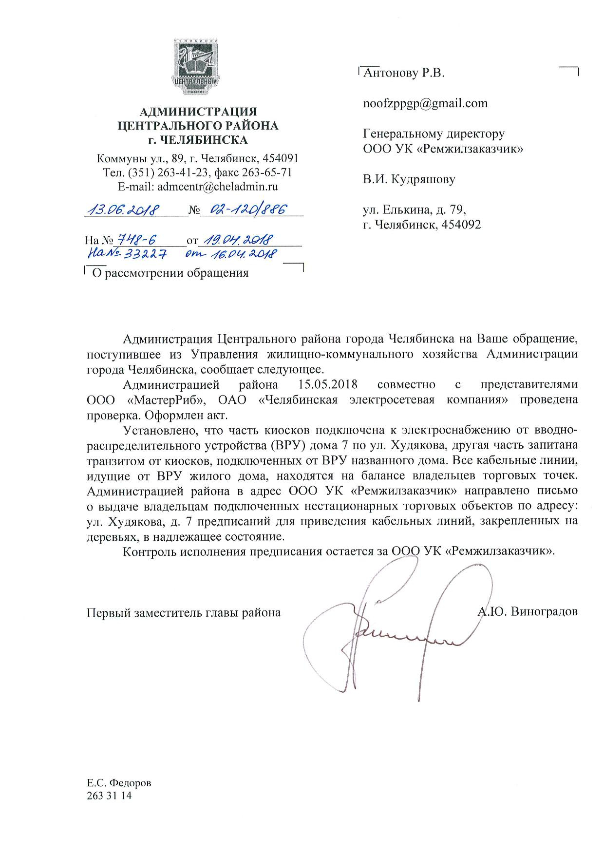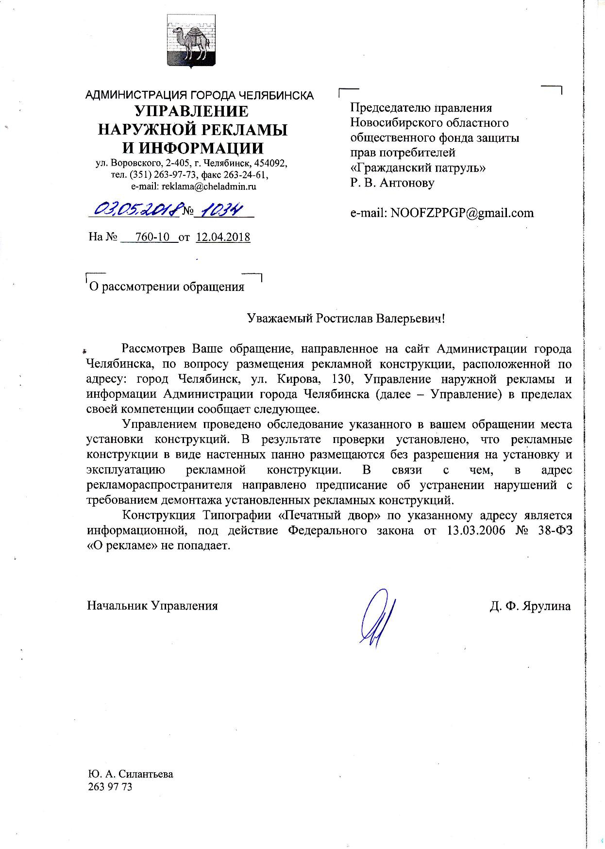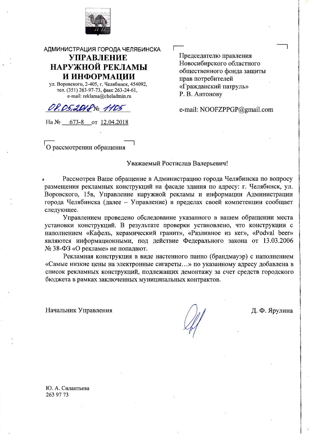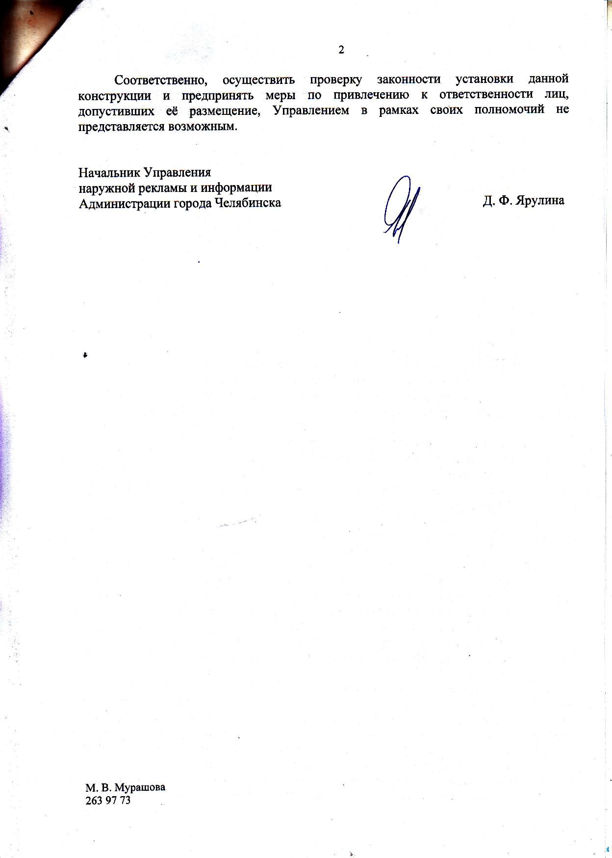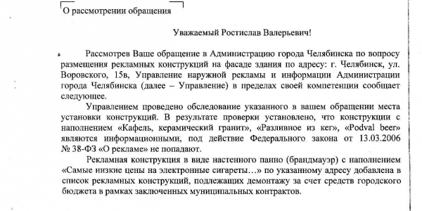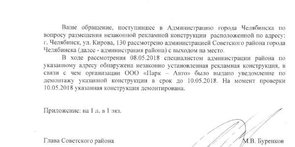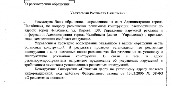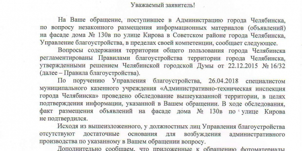 Номер жалобы:33280 Тип жалобы:Прочее Название объекта:Администрация Регион:Челябинская область Город:Челябинск Адрес:ул. Кирова, 130г Описание жалобы:Реклама на фасаде дома, портит внешний вид Статус: