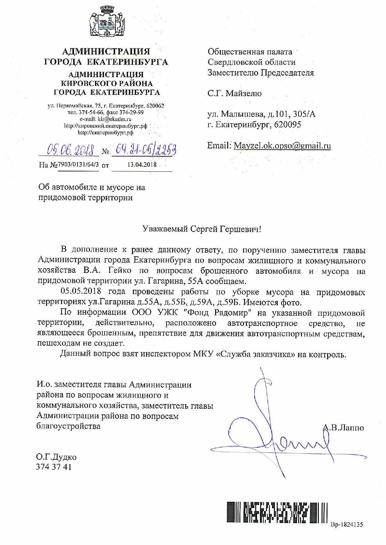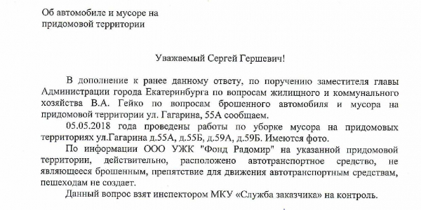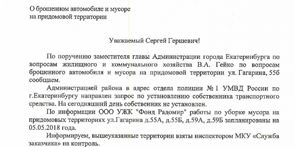 Номер жалобы:33258 Тип жалобы:Прочее Название объекта:. Регион:Свердловская область Город:Екатеринбург Адрес:ул. Гагарина, 55А Описание жалобы:Оставленный мусор и авто во дворе жилого дома Гагарина 55а. Статус: