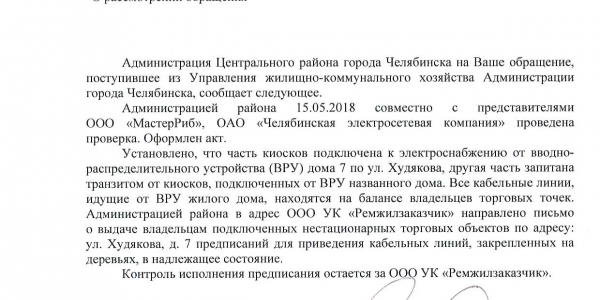 Номер жалобы:33227 Тип жалобы:Прочее Название объекта:Администрация Регион:Челябинская область Город:Челябинск Адрес:ул. Худякова, 7 Описание жалобы:Провода ларьков закреплены на деревьях 748-6 Статус:
