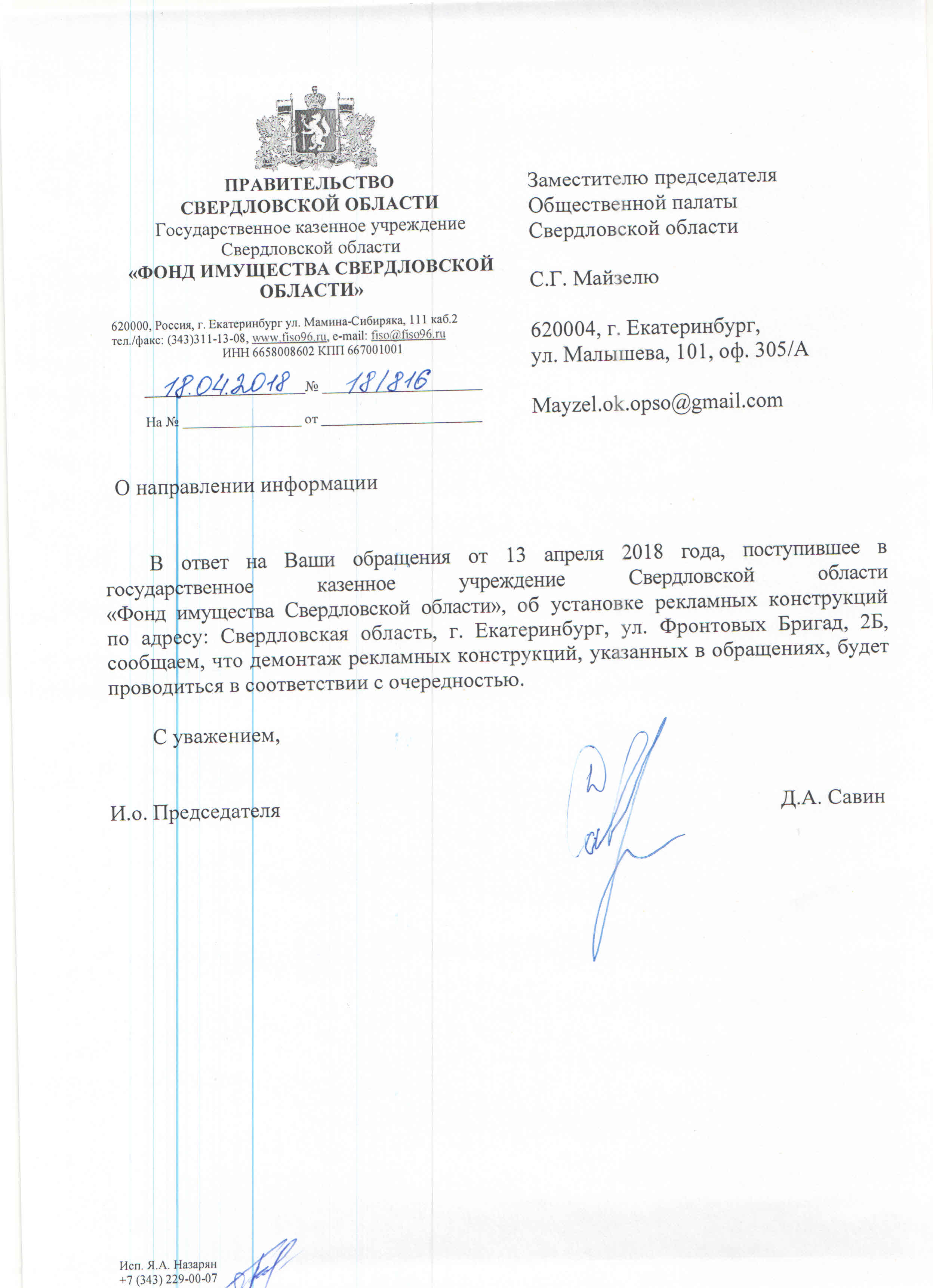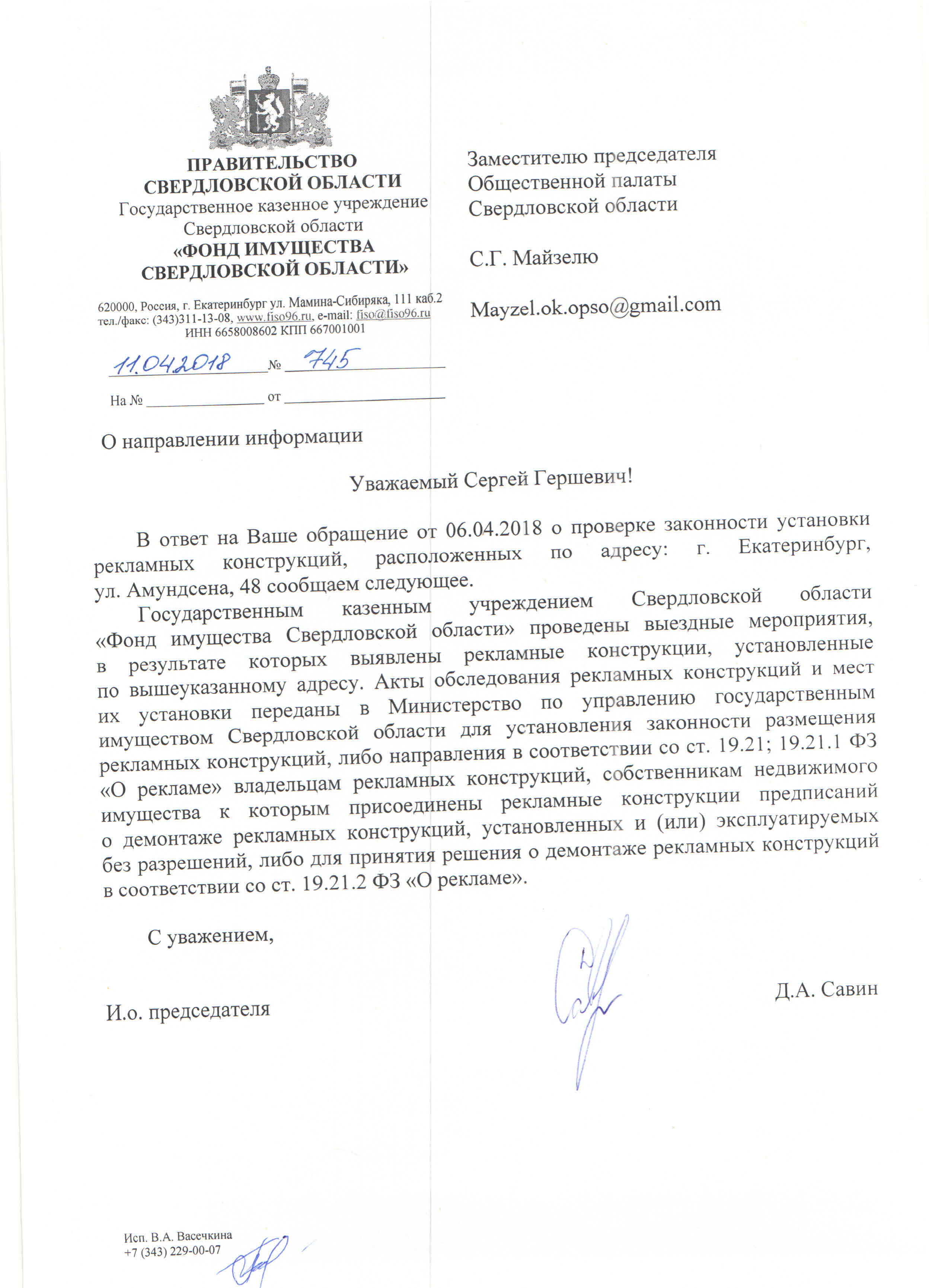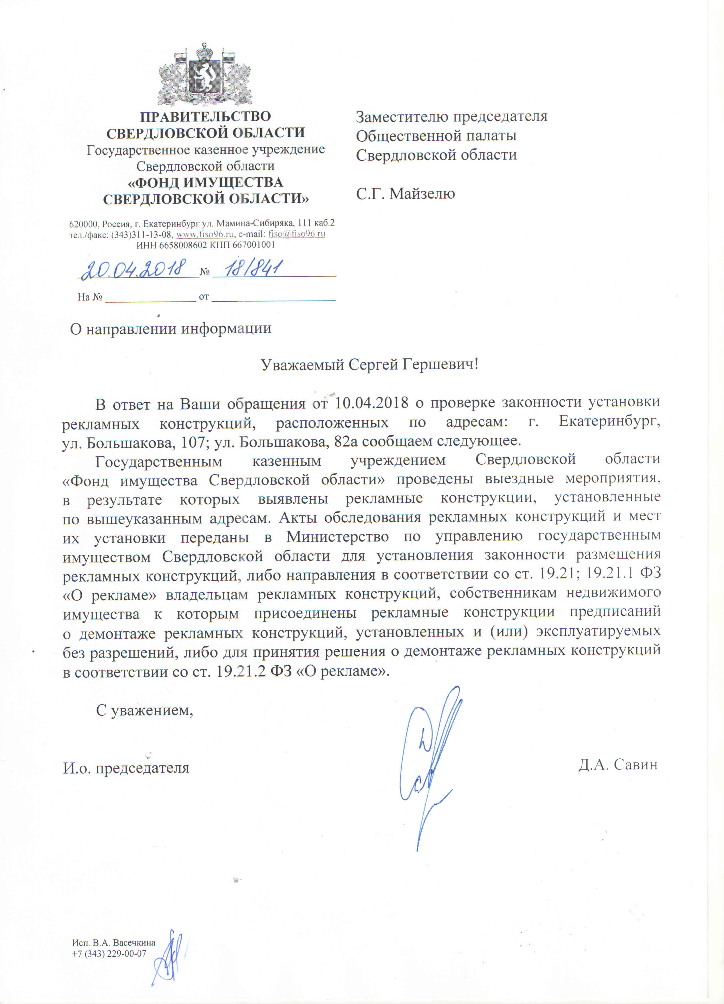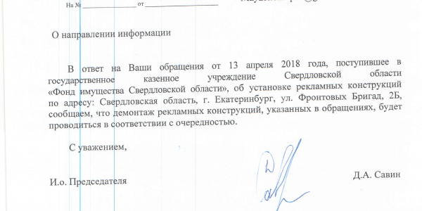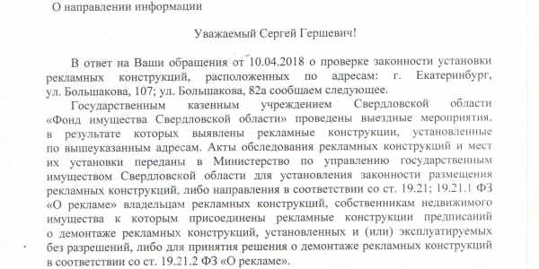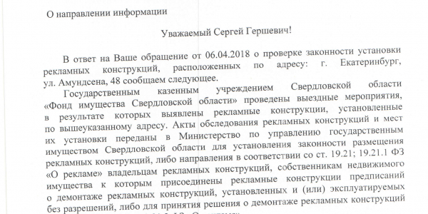 Номер жалобы:32946 Тип жалобы:Прочее Название объекта:МУГИСО Город:Екатеринбург Адрес:Екатеринбург, улица Амундсена, 48 Описание жалобы:Незаконные рекламные конструкции со стороны ул. Волгоградской Статус: