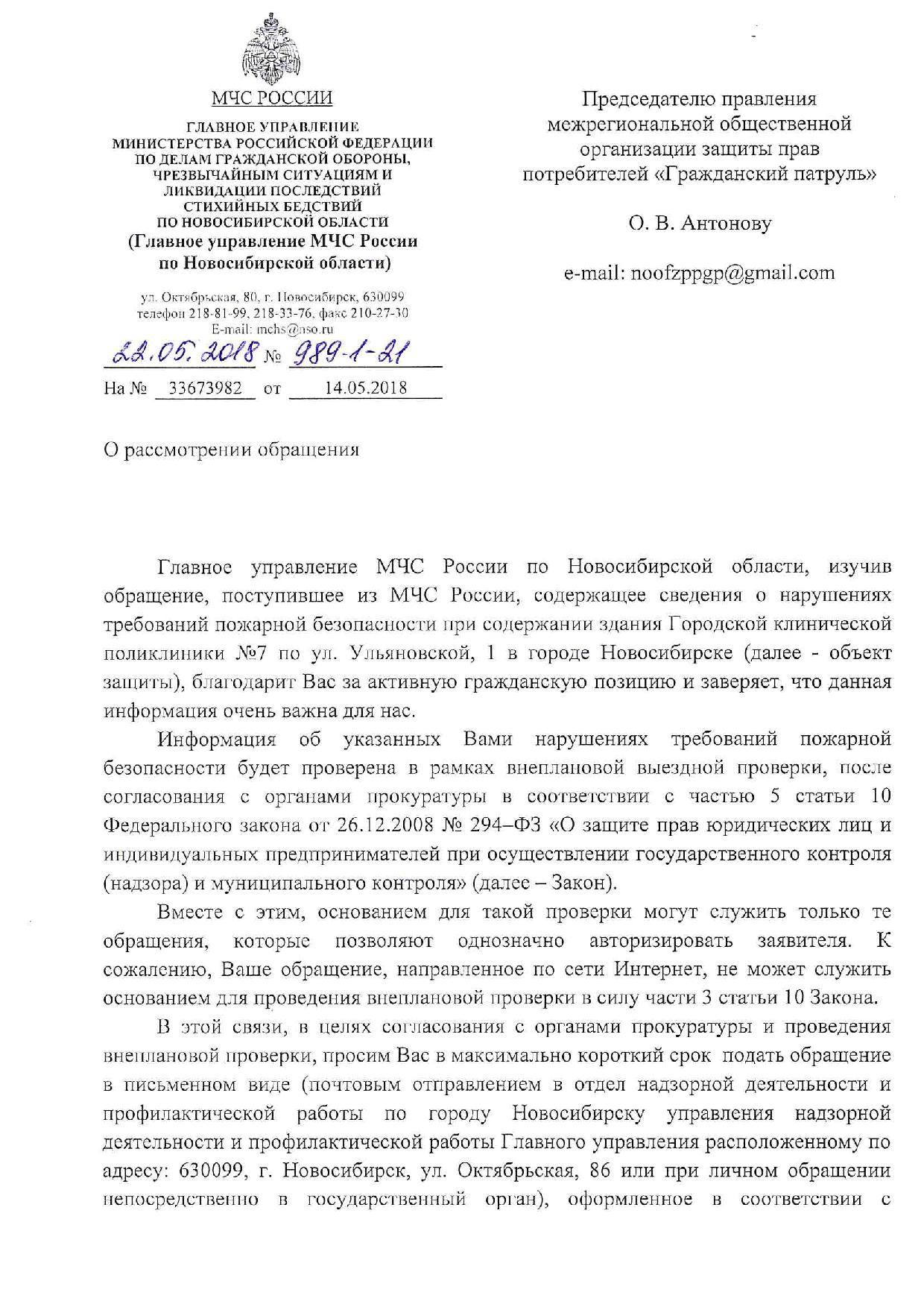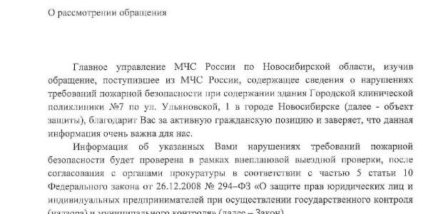Номер жалобы:32951 Тип жалобы:Прочее Название объекта:Титов Игорь Геннадьевич Город:Новосибирк Адрес:ул. Ульяновская, 1 Описание жалобы:Не нашел темы про пожарную безопасность. 29.03.2018 года был в поликлинике, на 3 этаже не увидел работающих индикаторов дыма на потолке. В моем офисе лампочка мигает, в больнице нет + над дверями не было никакой информации о выходе (ожидаю горящей зеленой таблички «Выход»), но были таблички над дверями в коридоре. То есть, вдоль всего здания идет коридор, по середине коридора стоят двери и над ними надпить «Выхода Нет»Фото не прикладываю, так как нужно указать динамику, не просто фото потолка. Статус: