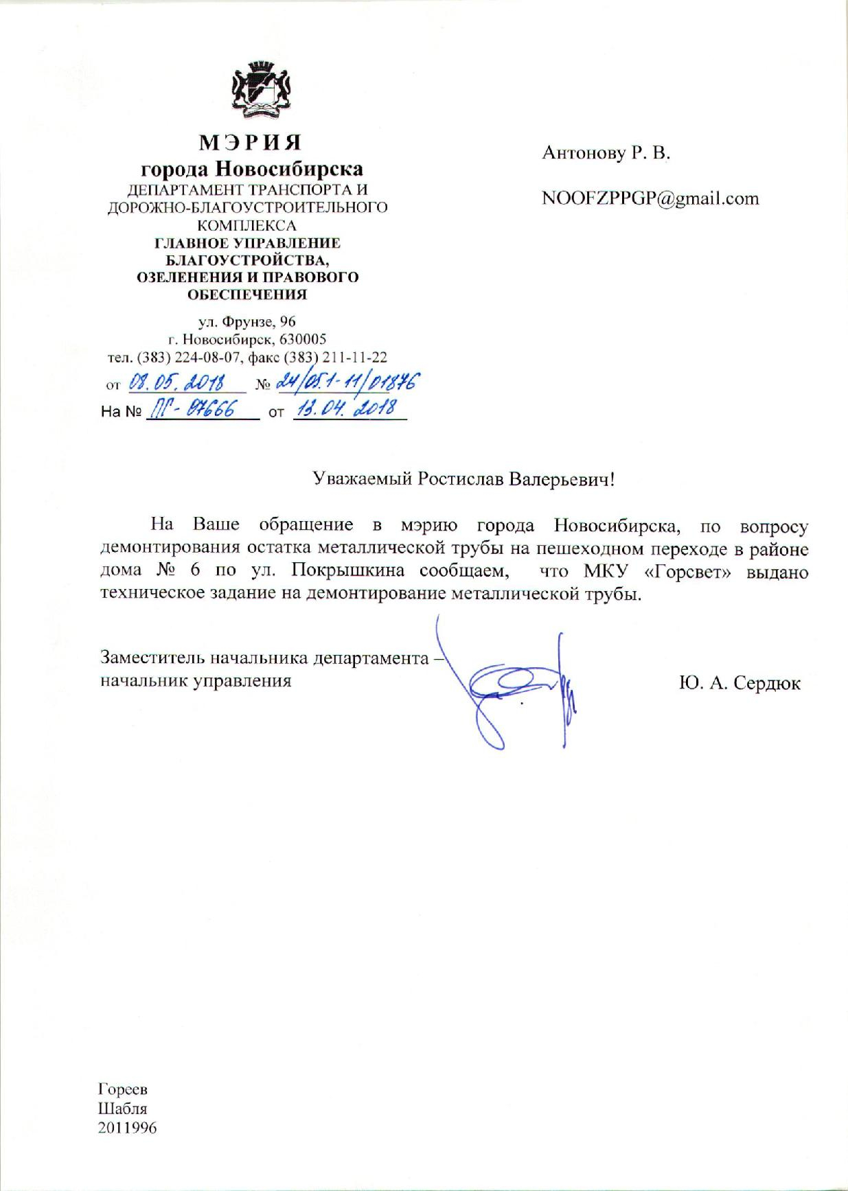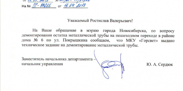 Номер жалобы:32984 Тип жалобы:Прочее Название объекта:Не Установлено Регион:Новосибирская область Город:Новосибирск Адрес:ул. Покрышкина, 6 Описание жалобы:Опасный остаток дорожного знака торчит на пешеходном переходе. Женщина споткнулась, пролетела несколько метров и упала. Необходимо демонтировать данный рудимент и привести пешеходную зону в належащий вид. Сделать её безопасной Статус: