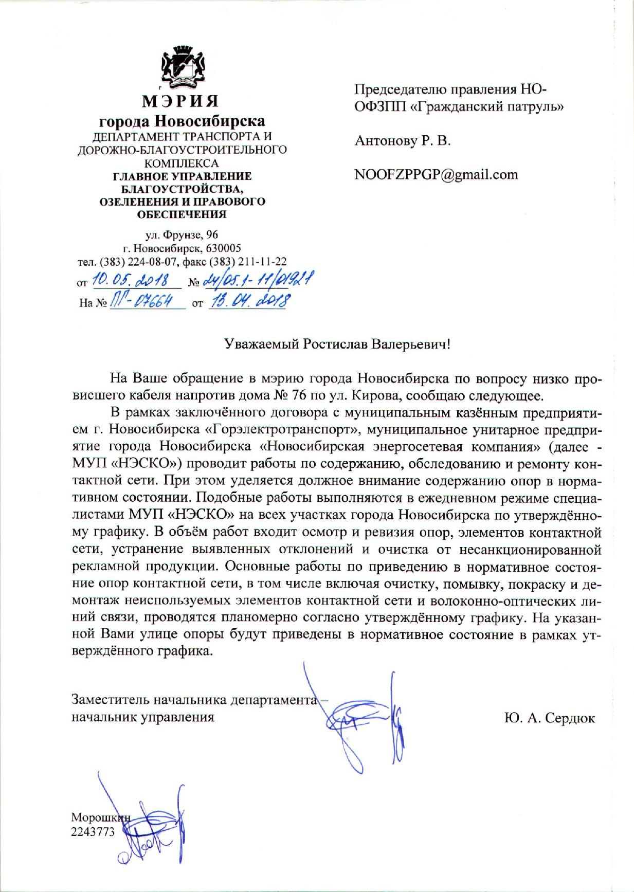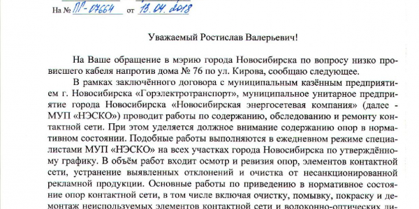 Номер жалобы:32996 Тип жалобы:Прочее Название объекта:Не Установлено Регион:Новосибирская область Город:Новосибирск Адрес:ул. Кирова, 76 Описание жалобы:Опасный весит кабель. Очень низко провисает Статус: