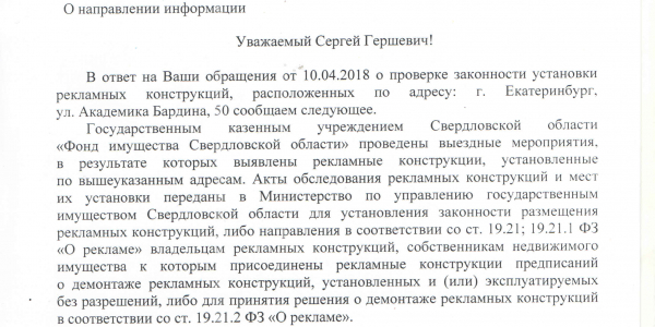 Номер жалобы:32991 Тип жалобы:Прочее Название объекта:Г. Екатеринбург Город:Екатеринбург Адрес:Екатеринбург, улица Академика Бардина, 50 Описание жалобы:Незаконные рекламные щиты Статус: