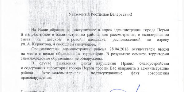 Номер жалобы:32596 Тип жалобы:Прочее Название объекта:Снег На Площадке Регион:Пермский край Город:Пермь Адрес:ул. Академика Курчатова, 4 Описание жалобы:Вот так относятся автомобилисты и управление, по Курчатова 4а, к ДЕТЯМ и остальным жильцам!!! Всю зиму, весь снег, с грязью, со своей стоянки и дороги сваливают на детскую площадку! А когда растает всё, то дети будут в грязевой каше "купаться" и всё лето бегать Статус: