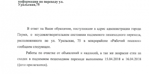 Номер жалобы:32598 Тип жалобы:Прочее Название объекта:Реклама Регион:Пермский край Город:Пермь Адрес:ул. Уральская, 81 Описание жалобы:Подземный переход на остановке " Рабочий Поселок" в Мотовилихе. Статус: