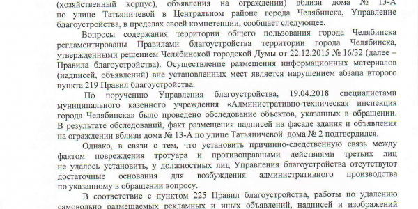 Номер жалобы:33249 Тип жалобы:Иные проблемы ЖКХ Название объекта:Администрация Челябинска Регион:Челябинская область Город:Челябинск Адрес:ул. Татьяничевой, 13А Описание жалобы:На стене хоз. Блока вандальная надпись портит красивую роспись стены. Прошу аккуратно закрасить только надпись, не повредив основной рисунок, подобрать цвет в тон стены. И прошу убрать рядом с хозблоком рекламу техосмотра на заборе Статус: