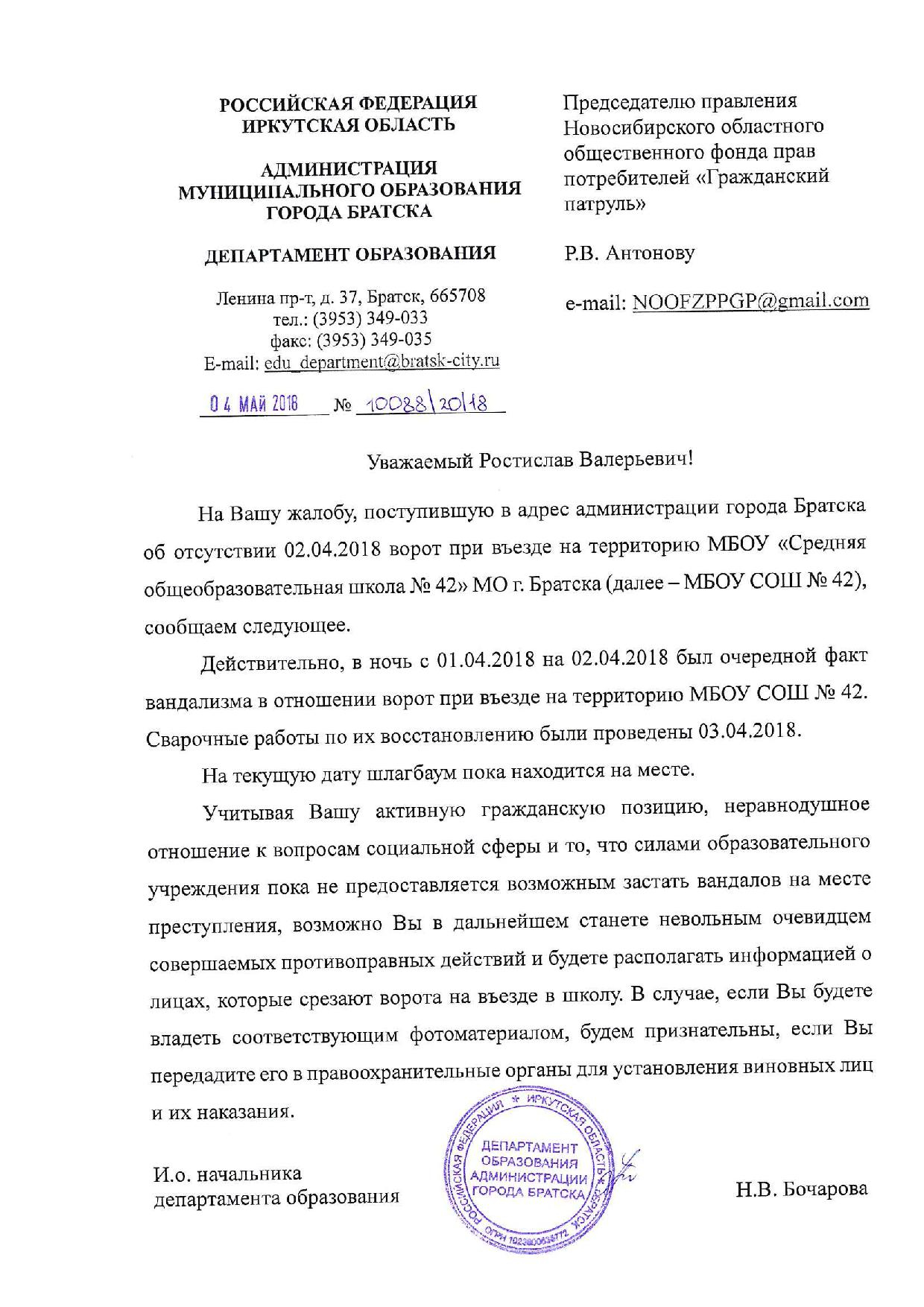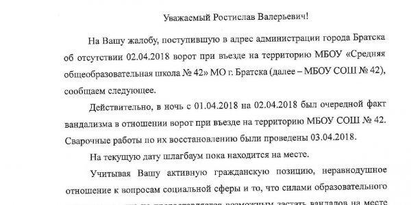 Номер жалобы:32517 Тип жалобы:Прочее Название объекта:Адм Регион:Иркутская область Город:Братск Адрес:ул. Крупской, 39 Описание жалобы:Опять пропали ворота школы 42. Полностью. Статус:
