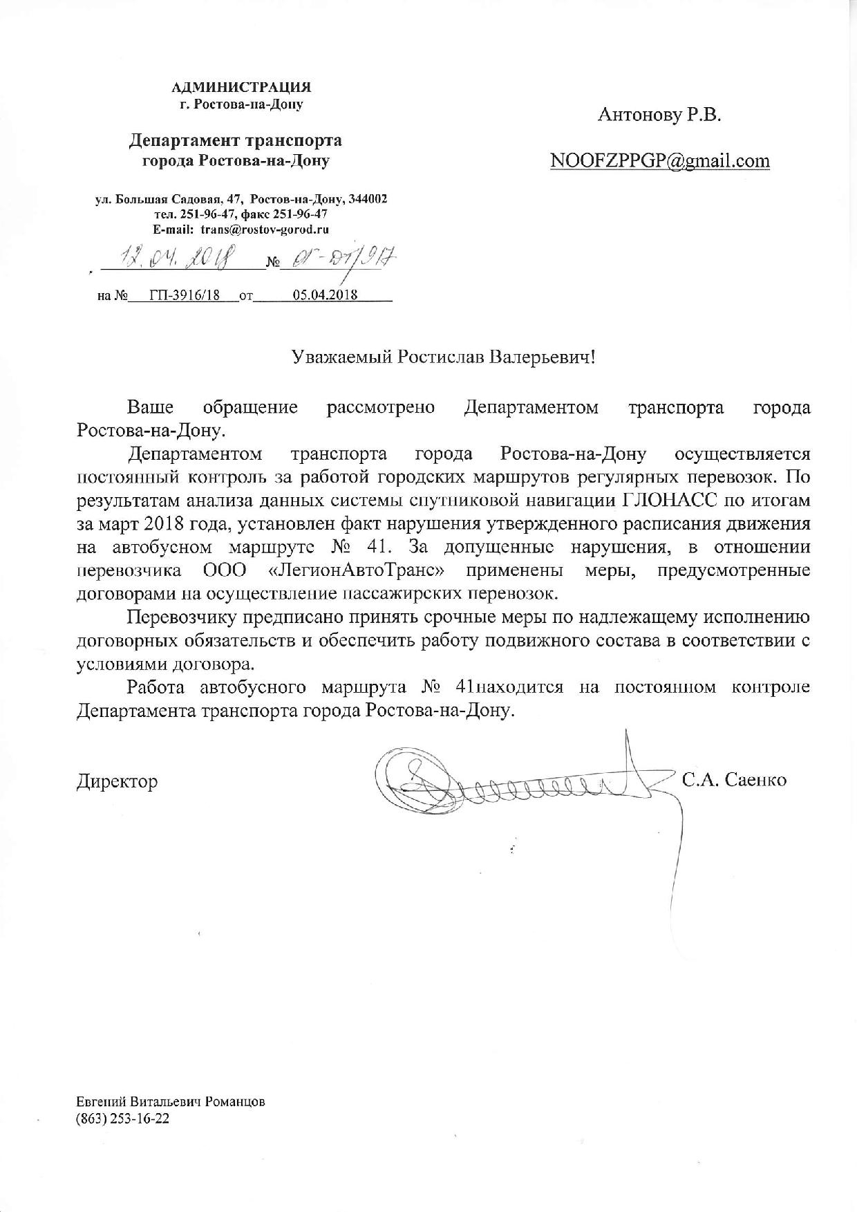 Номер жалобы:32528 Тип жалобы:Прочее Название объекта:Департамент транспорта г.Ростов-на-Дону Город:Ростов-на-Дону Адрес:Центральный рынок Описание жалобы:Дата и время нарушения 24.03.2018 20:19