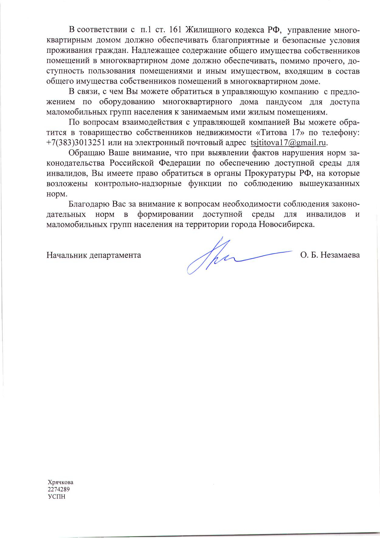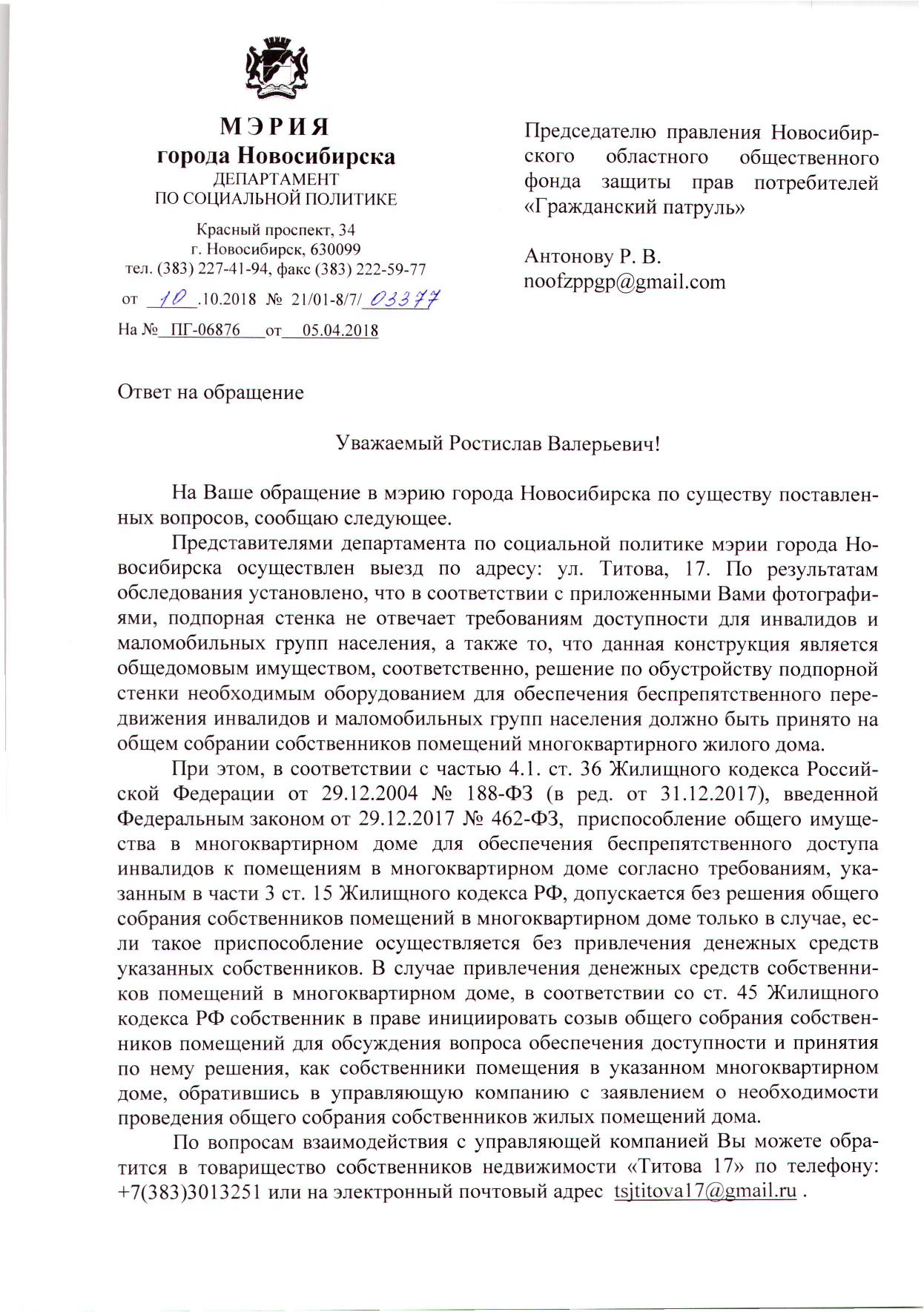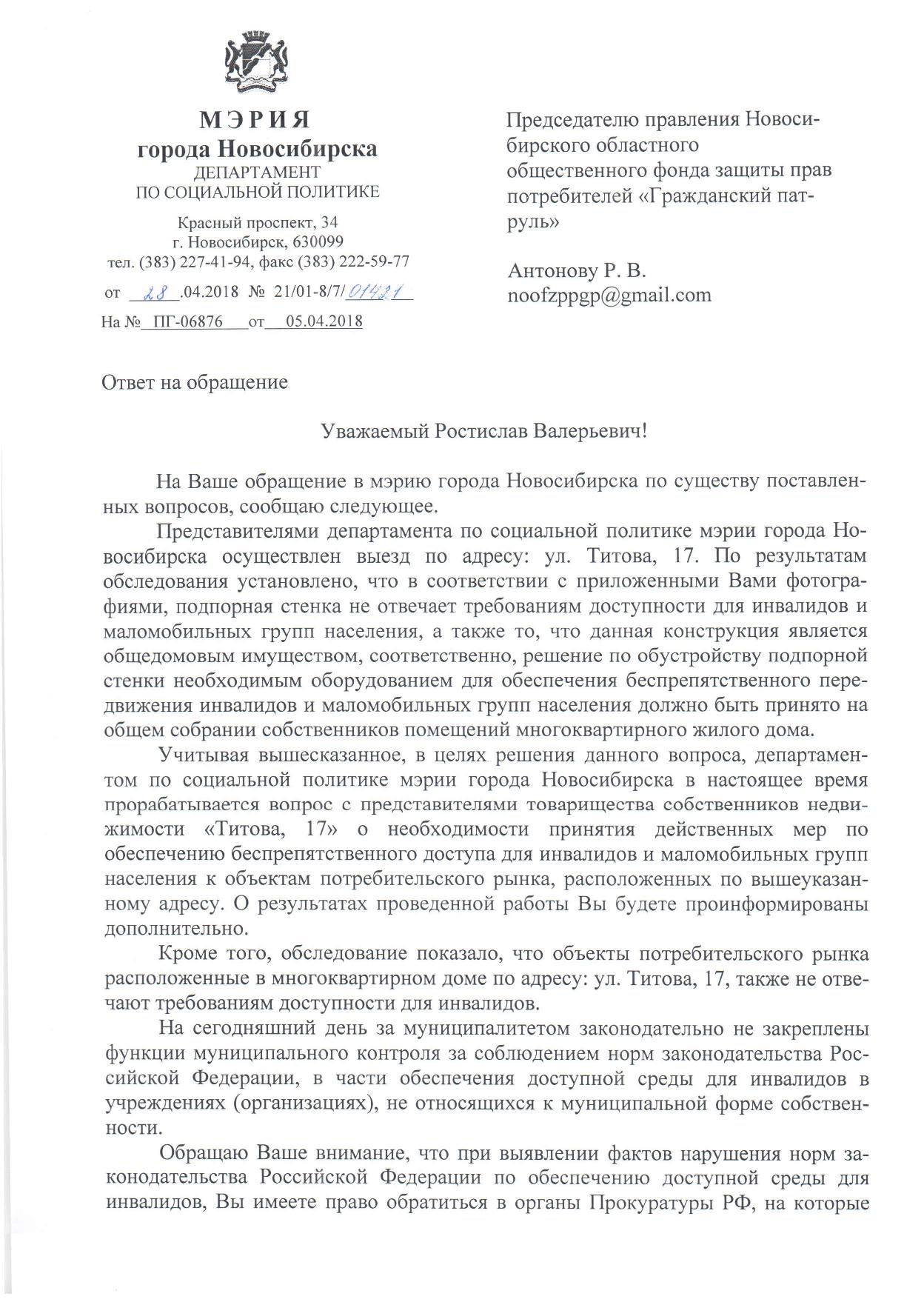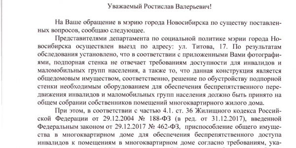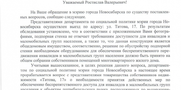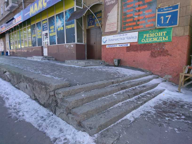 Номер жалобы:32533 Тип жалобы:Прочее Название объекта:Не Установлено Регион:Новосибирская область Город:Новосибирск Адрес:ул. Титова, 17 Описание жалобы:Необходимо сделать пандус для колясок. С коляской для детей не подняться в магазин Статус:
