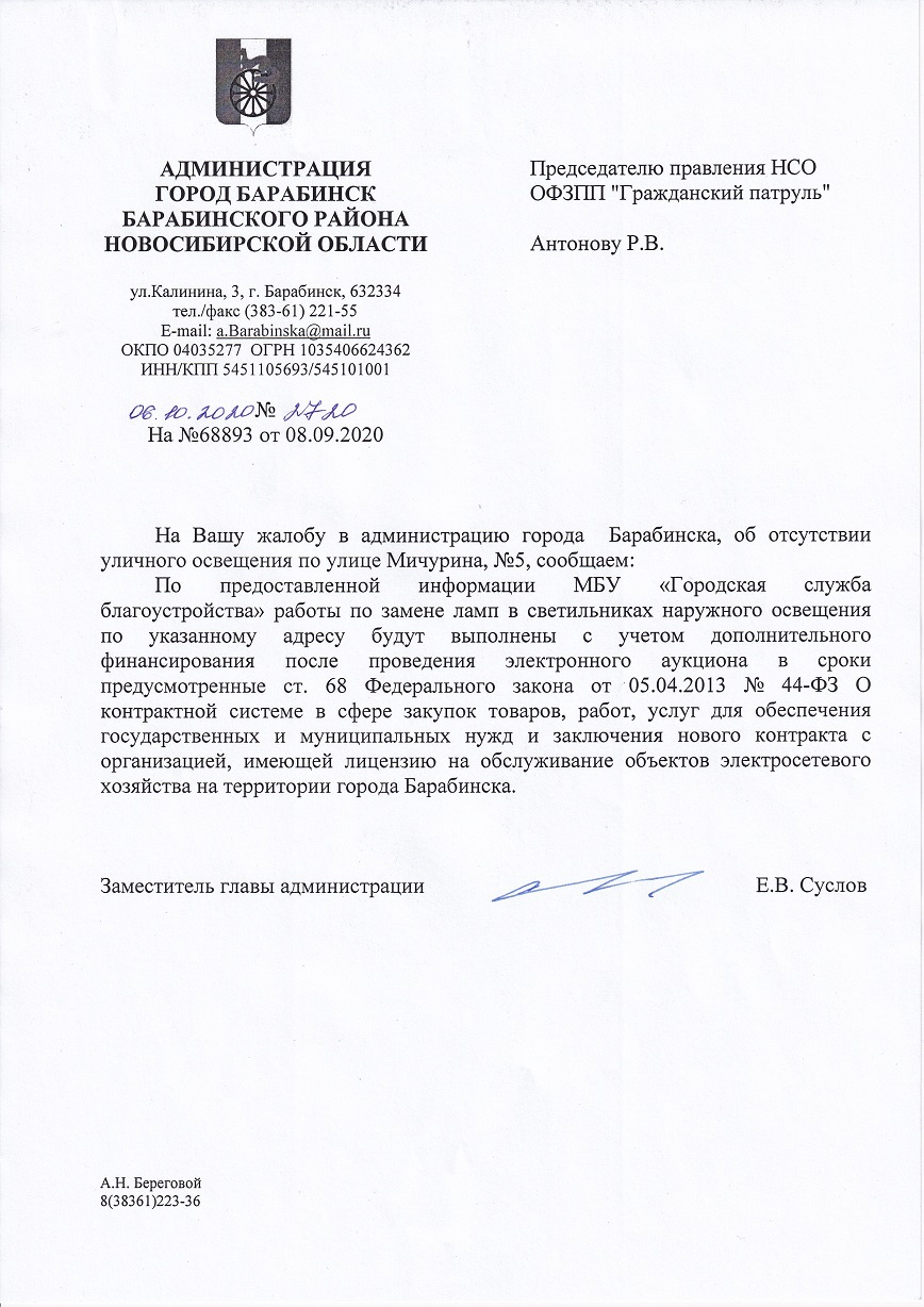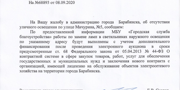 Номер жалобы:68893 Тип жалобы:Прочее Название объекта: Регион:Новосибирская область Город:Барабинск Адрес:улица Мичурина, 5 Описание жалобы:Отсутствие освещения. Детям темно добираться до школы. Ул. Мичурина д. 5 Статус: