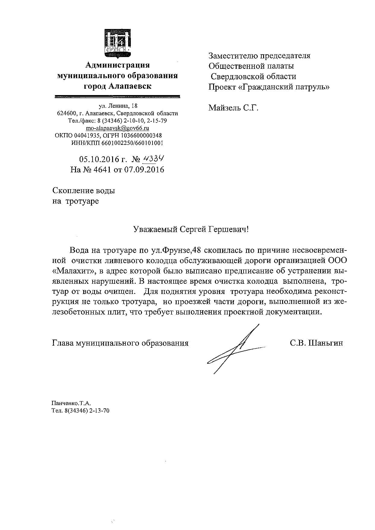 Номер жалобы:8407 Тип жалобы:Ямы на тротуарах Название объекта: Регион:Свердловская область Город:Алапаевск Адрес:Фрунзе, 48 Описание жалобы:Лужа на всю ширину тротуара, необходимо поднять уровень тротуара Статус: