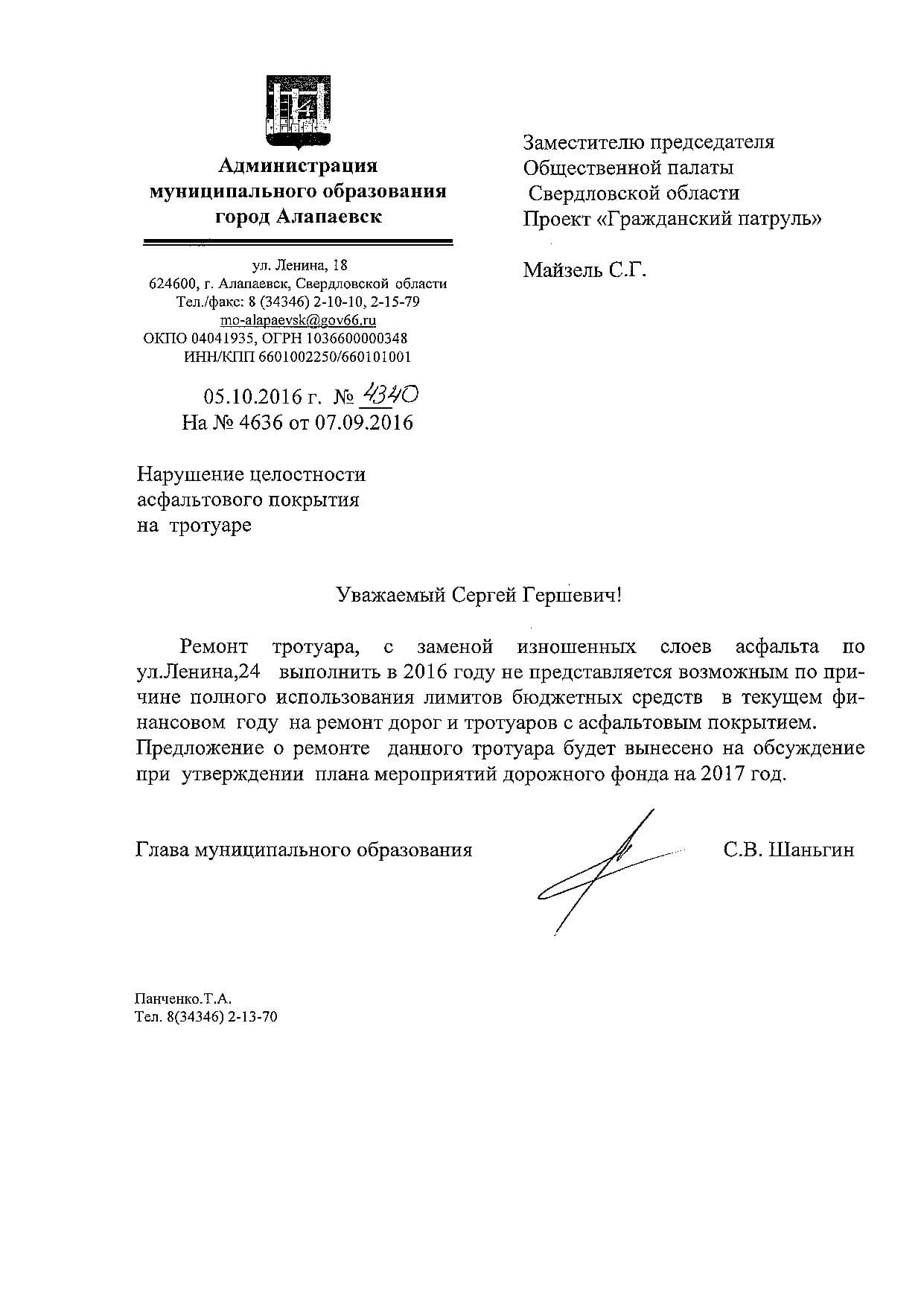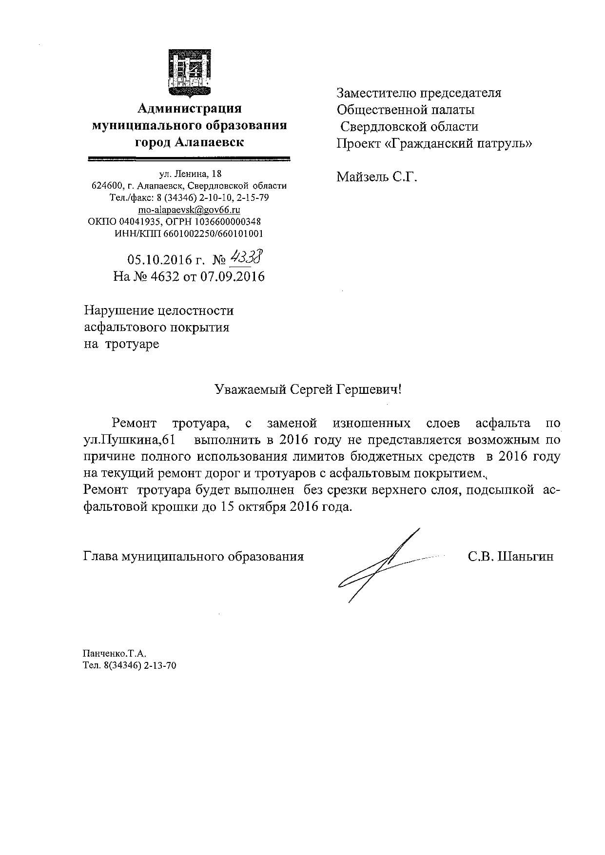 Номер жалобы:8403 Тип жалобы:Ямы на тротуарах Название объекта: Регион:Свердловская область Город:Алапаевск Адрес:Пушкина, 61 Описание жалобы:Ямы на тротуарах Статус: