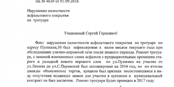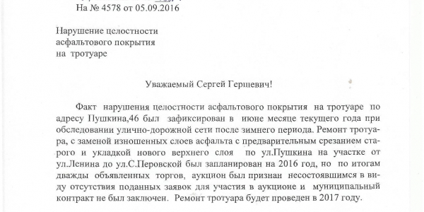 Номер жалобы:8401 Тип жалобы:Ямы на тротуарах Название объекта: Регион:Свердловская область Город:Алапаевск Адрес:Пушкина, 49 Описание жалобы:Ямы на тротуарах Статус: