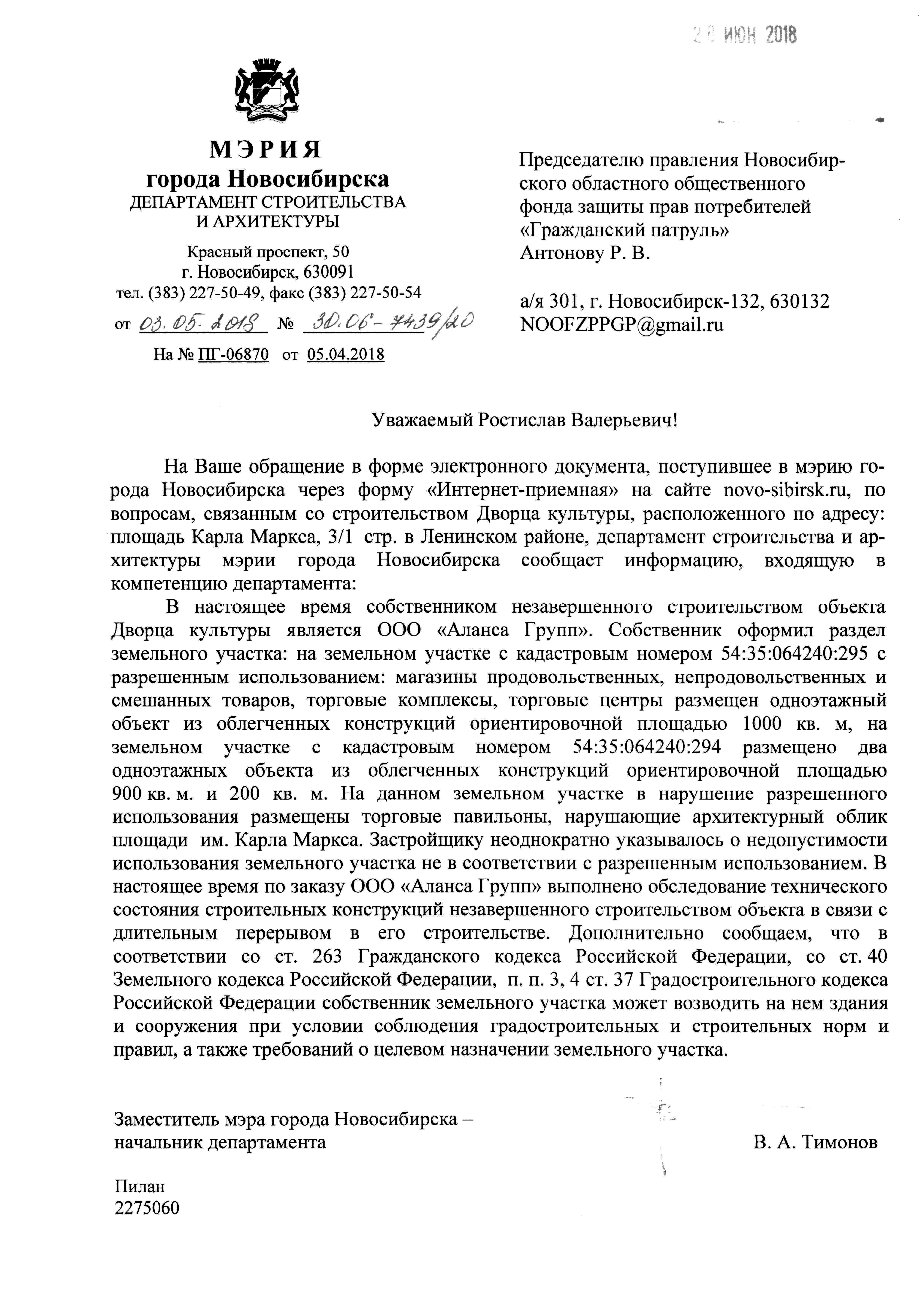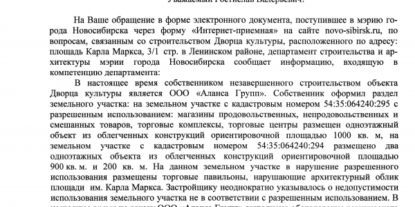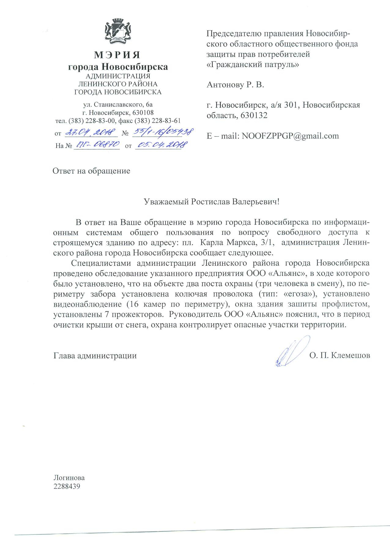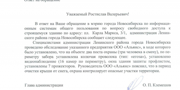 Номер жалобы:32435 Тип жалобы:Прочее Название объекта:Частник Регион:Новосибирская область Город:Новосибирск Адрес:пл. Карла Маркса, 3/1 Описание жалобы:Всем привет. Был свидетелем того, что подросток пробрался на частную территорию долгостроя, похитил огнетушитель с пожарного щита и пытался скрыться. Сообщил охране, нашли парня. На территории ведутся работы по очистке кровли от снега. С крыши рабочие кидают снег и лёд. Подросток прошёл по этому опасном участку, куда падает снег и совершил это деяние. Мог ведь пострадать, от льда или снега упавшие на него. Необходимо залатать дыры в заборе и усилить охрану, чтобы дети не попадали туда, и посторонние. Статус: