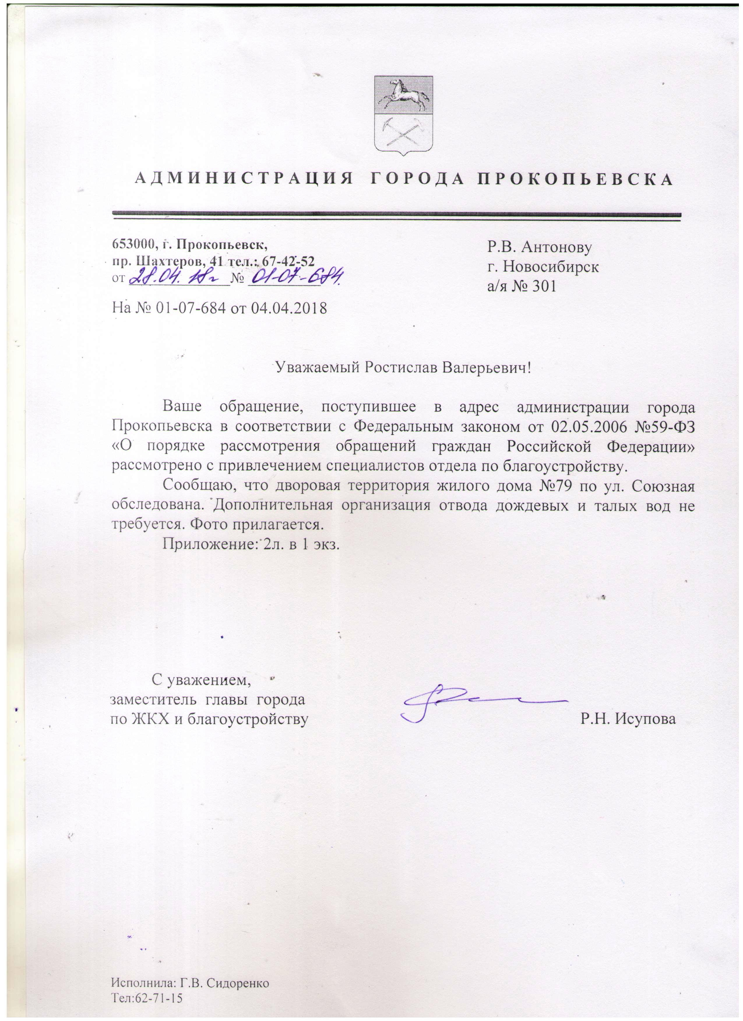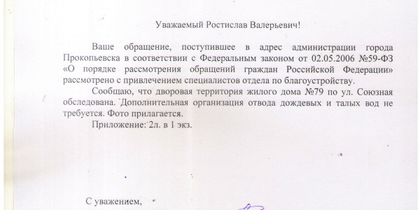 Номер жалобы:32513 Тип жалобы:Прочее Название объекта:1 Регион:Кемеровская область Город:Прокопьевск Адрес:ул. Союзная, 79 Описание жалобы:Плохо пропустили отвод воды из двора Статус: