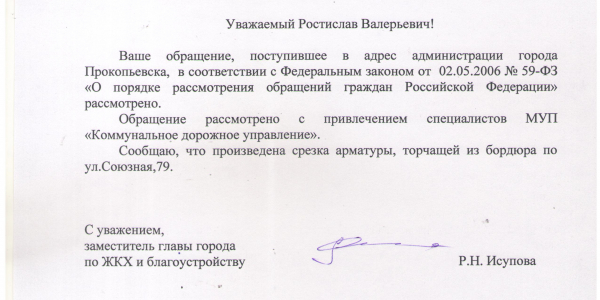 Номер жалобы:32468 Тип жалобы:Прочее Название объекта:Прокуратура Города Челябинска Город:Челябинск Адрес:Челябинск, улица 250-Летия Челябинска, 16 Описание жалобы:Прошу проверить действия Комитета по Управлению имуществом и земельными отношениями города Челябинска в отношении исполнения «Положения о порядке выявления, перемещения, хранения брошенных транспортных средств на территории города Челябинска» по адресу: Челябинск, 250 лет Челябинска, 16 и 16А Статус: