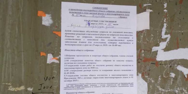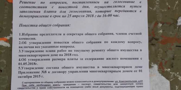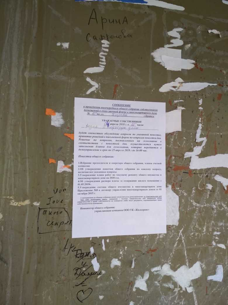 Номер жалобы:32683 Тип жалобы:Иные проблемы ЖКХ Название объекта:ООО УК "Жилсервис" Регион:Иркутская область Город:Братск Адрес:ул. Кирова, 10а Описание жалобы:УК развешала на подъездах объявление о проведении внеочередного собрания собственников 3.04.18 в 12.00. в назначенное время совственники увидели исправление в объявлении на 4.04.18. Исправление внесли ручкой не ранее чем за сутки. Жилищная инспекция отказывается консультировать по телефону о законности подобного факта. А на повестке дня между прочим вопрос увеличения платы. Статус: