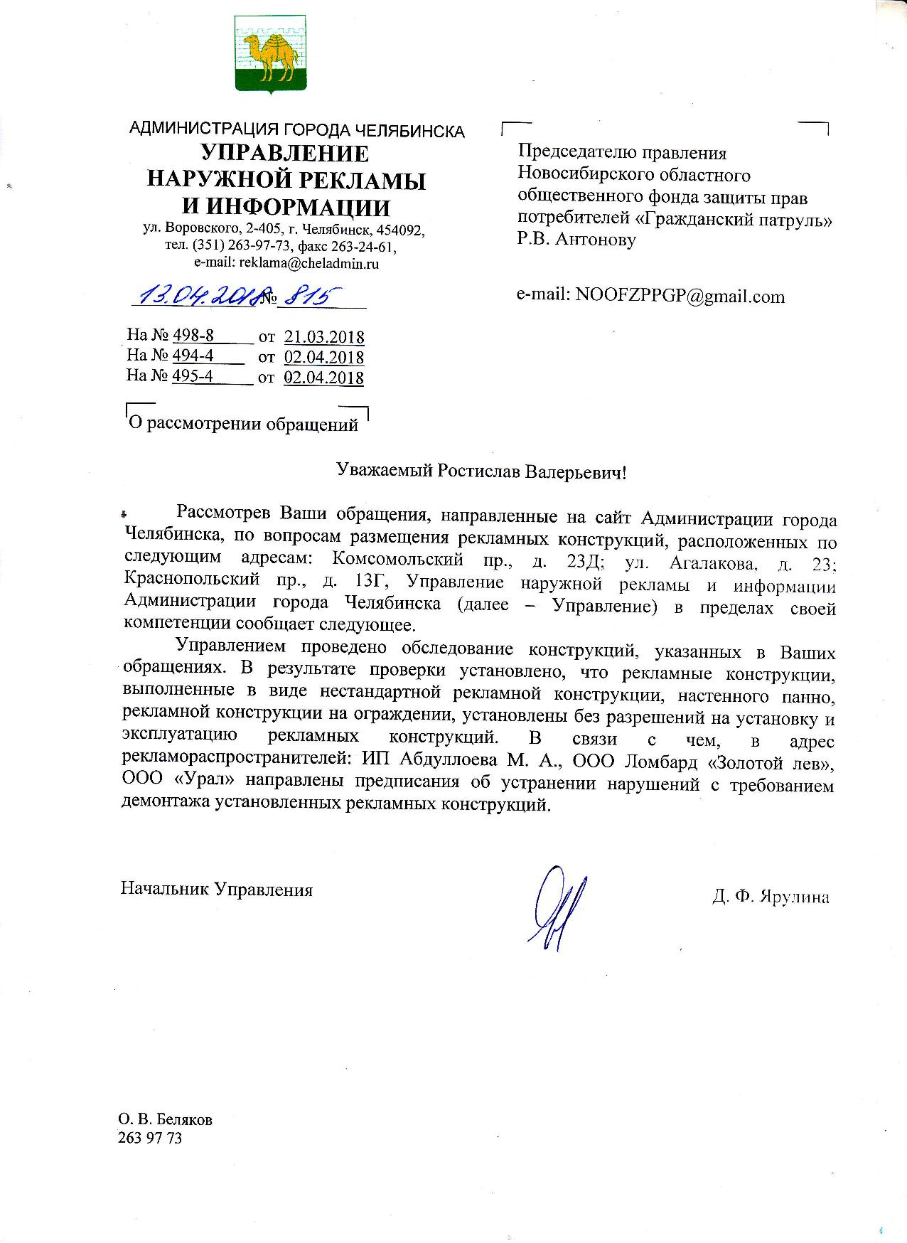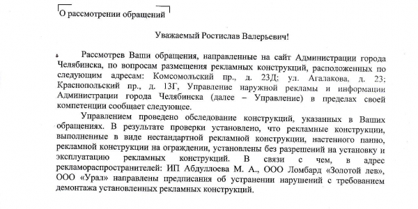 Номер жалобы:32401 Тип жалобы:Прочее Название объекта:Управление по наружной рекламе и информации администрации г. Челябинска Регион:Челябинская область Город:Челябинск Адрес:ул. Агалакова, 23 Описание жалобы:Обнаружено нарушение!