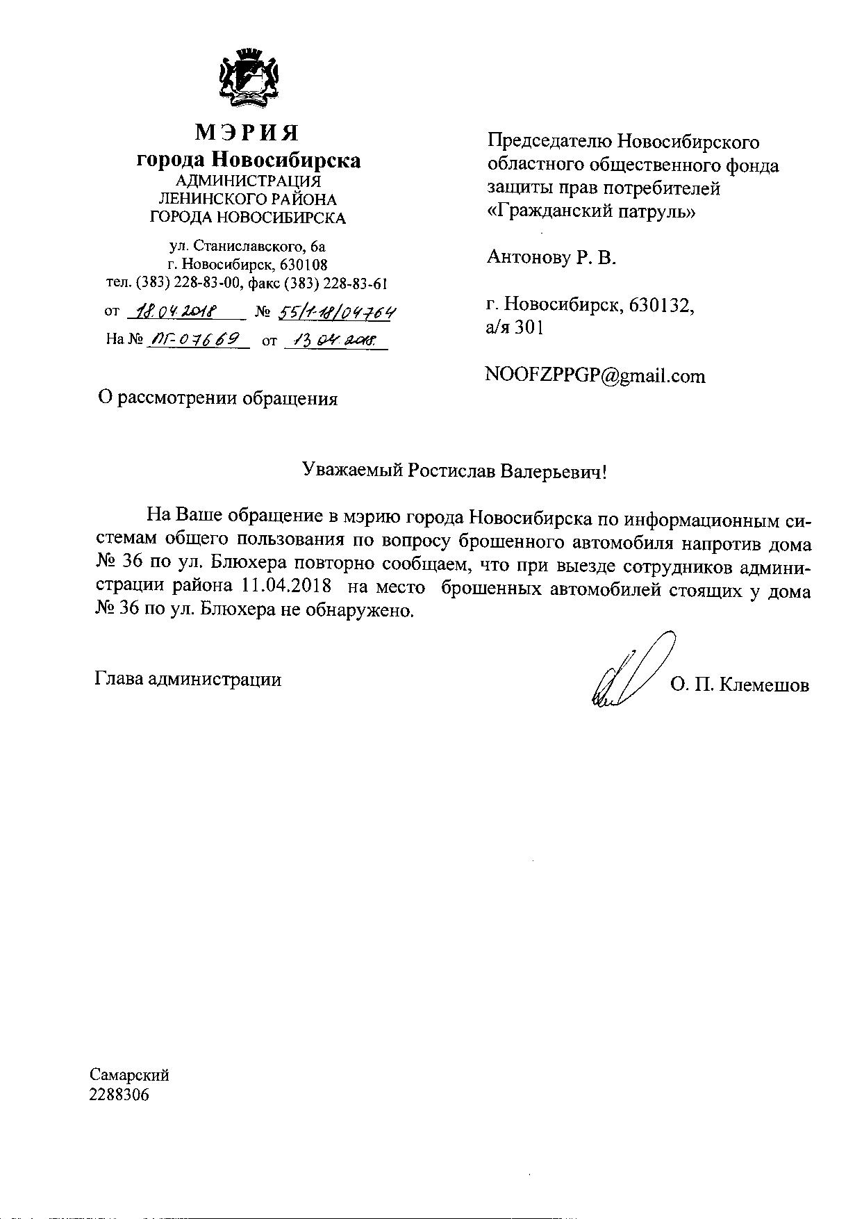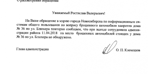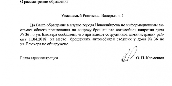 Номер жалобы:32299 Тип жалобы:Прочее Название объекта:Мэрия Регион:Новосибирская область Город:Новосибирск Адрес:ул. Блюхера, 36 Описание жалобы:Длительно заброшенная машина у бывшей остановки (рядом Блюхера 36) Статус: