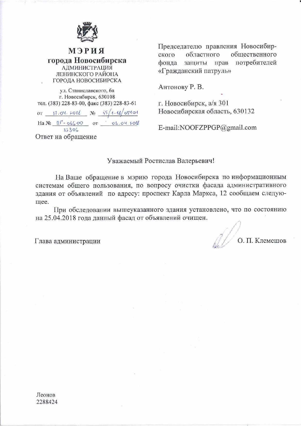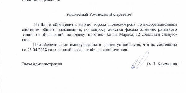 Номер жалобы:32306 Тип жалобы:Прочее Название объекта:Мэрия Регион:Новосибирская область Город:Новосибирск Адрес:пр. Карла Маркса, 12 Описание жалобы:Угол дома заклеен объявлениями. Маркса 12 Статус: