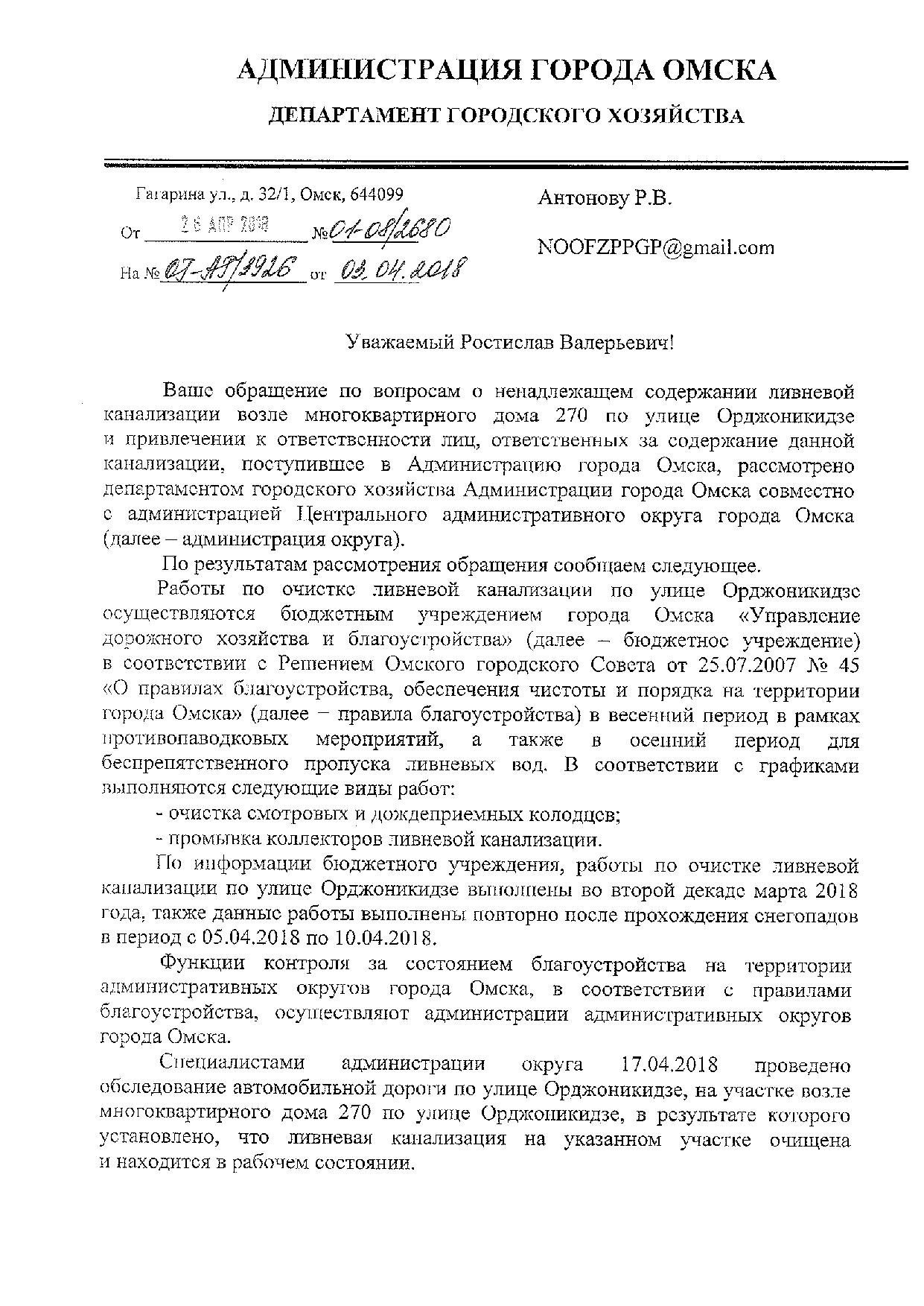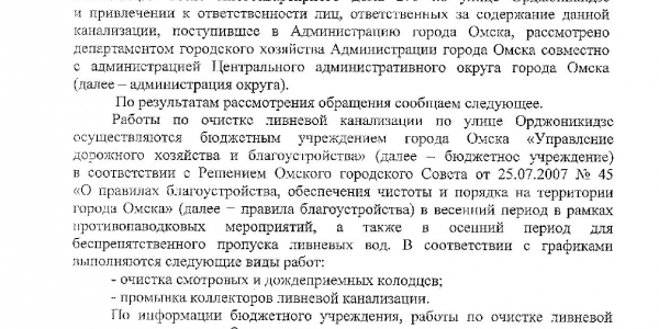 Номер жалобы:32410 Тип жалобы:Прочее Название объекта:Мэрия Регион:Омская область Город:Омск Адрес:ул. Орджоникидзе, 270 Описание жалобы:Ливневка забита Статус: