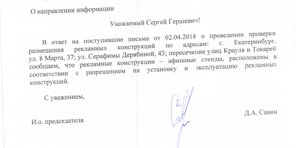 Номер жалобы:32414 Тип жалобы:Прочее Название объекта:Екатеринбург Регион:Свердловская область Город:Екатеринбург Адрес:ул. 8 Марта, 37 Описание жалобы:Рекламные щиты и рекламная скамейка напротив Гринвича Статус: