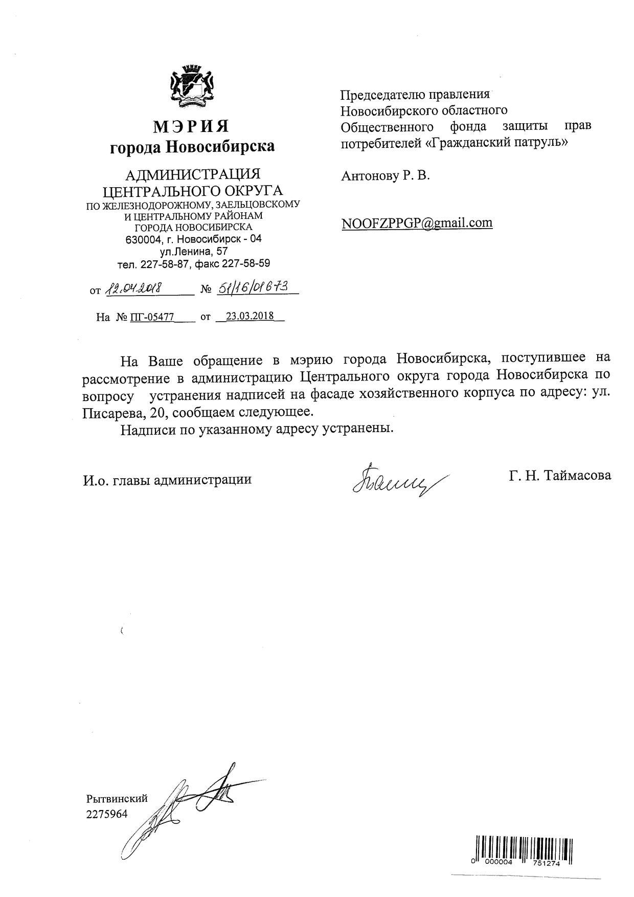 Номер жалобы:31983 Тип жалобы:Иные проблемы ЖКХ Название объекта:Управляющая Компания Регион:Новосибирская область Город:Новосибирск Адрес:ул. Писарева, 20 Описание жалобы:Надписи на хоз.корпусе Статус: