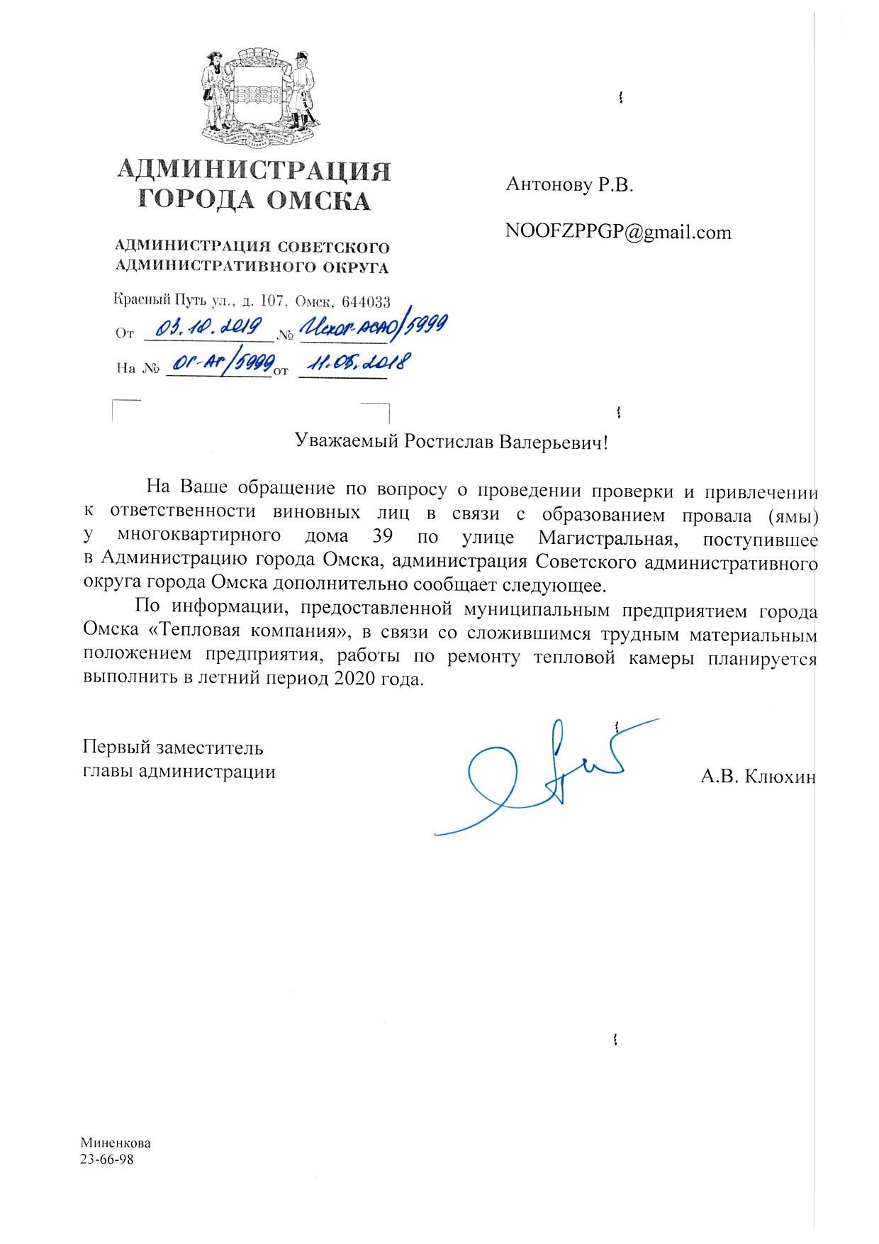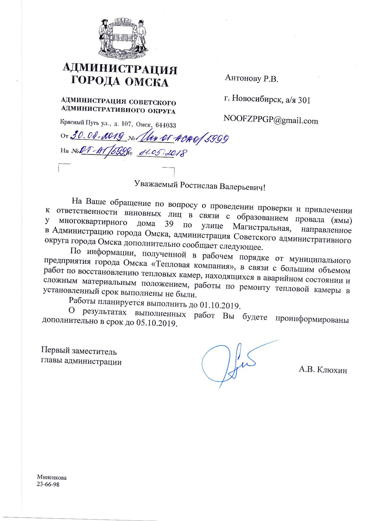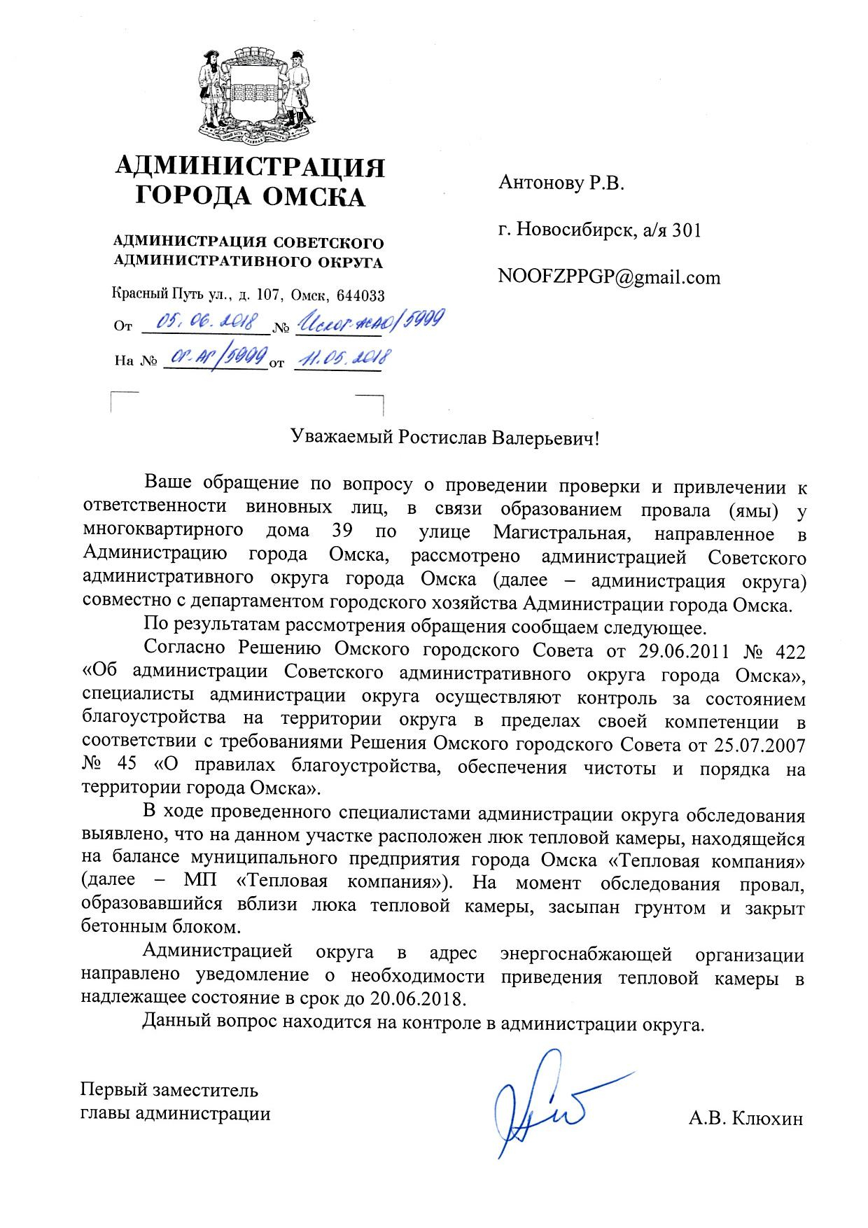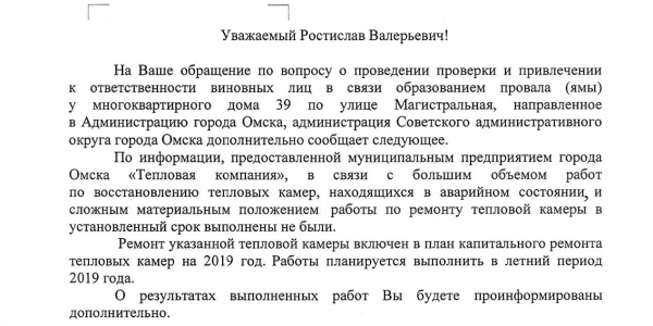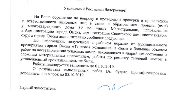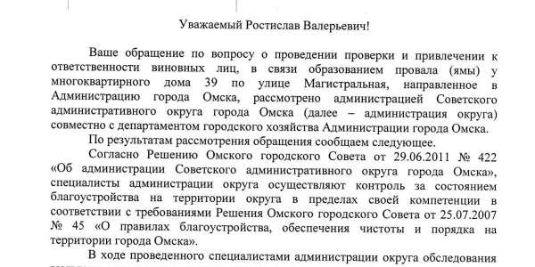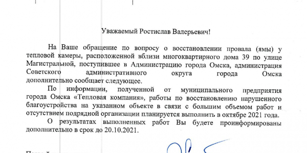 Номер жалобы:34527 Тип жалобы:Ямы во дворе Название объекта:Управляющая компания "Олимп" Регион:Омская область Город:Омск Адрес:Магистральная ул., 39 Описание жалобы:Образовался провал, во дворе много маленьких детей Статус: