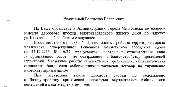 Номер жалобы:34010 Тип жалобы:Ямы во дворе Название объекта:Ямы на дороге Регион:Челябинская область Город:Челябинск Адрес:ул. Ключевая, 7 Описание жалобы:Очень большие выбоины на дороге во дворе. Необходимо провести ямочный ремонт. Статус: