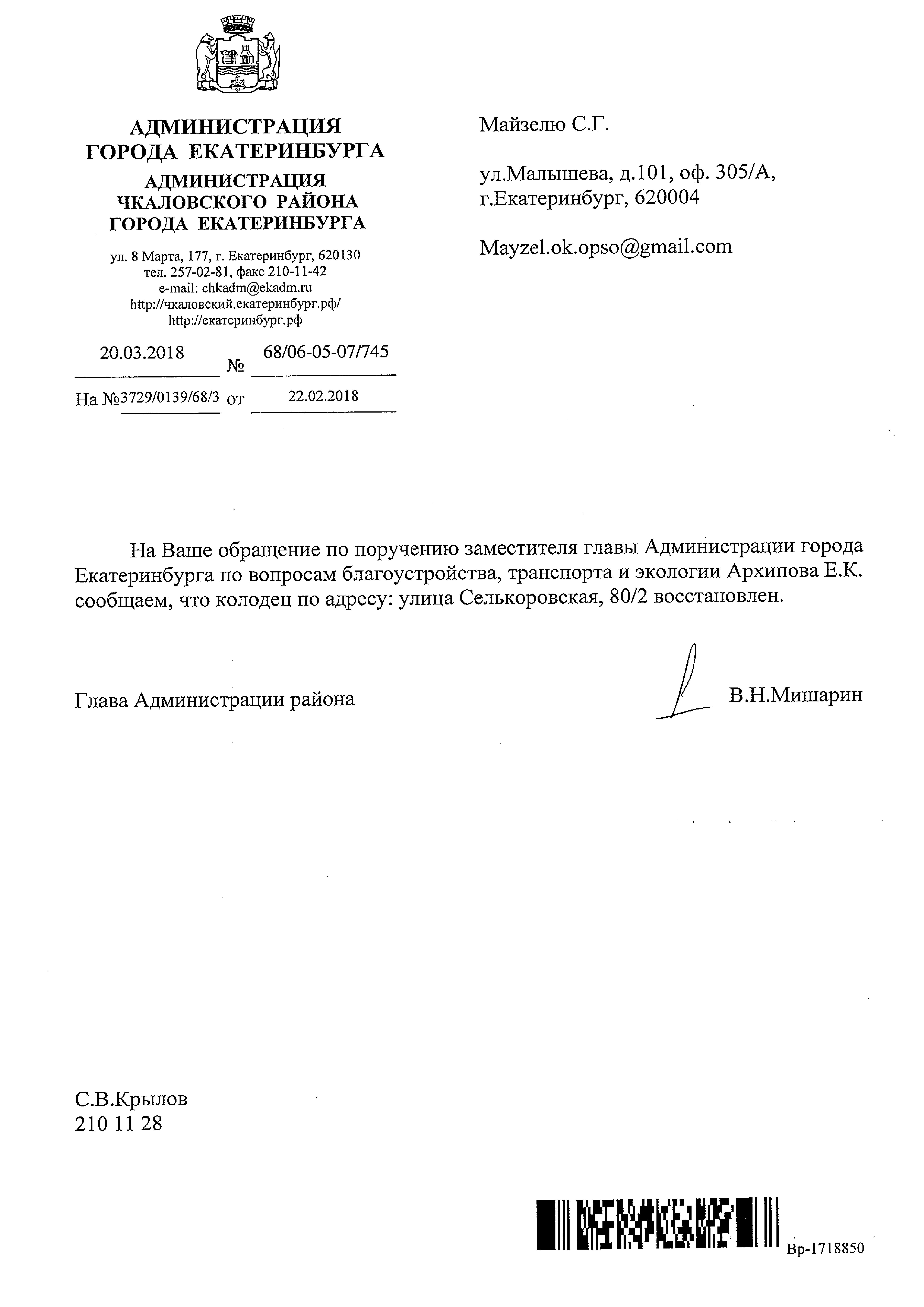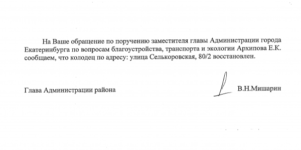 Номер жалобы:30651 Тип жалобы:Прочее Название объекта:Администрация Екатеринбурга Регион:Свердловская область Город:Екатеринбург Адрес:Селькоровская ул., 80/2 Описание жалобы:Открыт колодец. Статус: