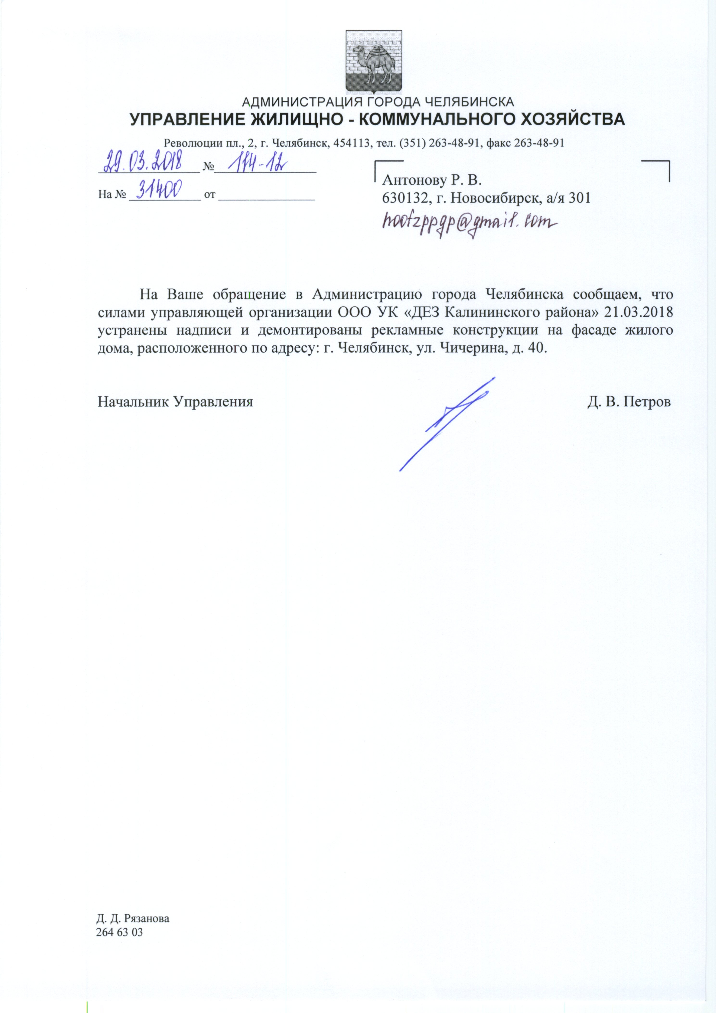 Номер жалобы:31400 Тип жалобы:Иные проблемы ЖКХ Название объекта:Администрация Калининского Района Регион:Челябинская область Город:Челябинск Адрес:ул. Чичерина, 40 Описание жалобы:Граффити на стене, старые рекламные конструкции, стена обклеена рекламными листовками. Прошу устранить эти недочёты. Проверьте легальность парковочных мест Статус: