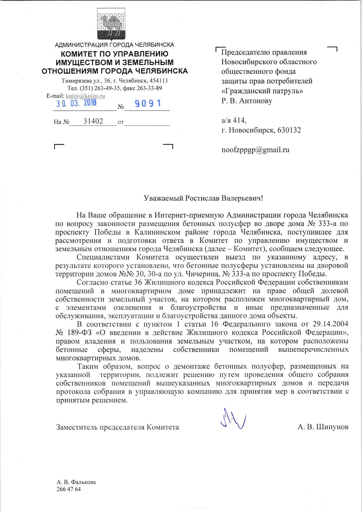 Номер жалобы:31402 Тип жалобы:Иные проблемы ЖКХ Название объекта:Администрация Калининского Района Регион:Челябинская область Город:Челябинск Адрес:просп. Победы, 333А Описание жалобы:Несанкционированная парковка на газоне. На месте имеются битоные полусферы. Прошу переместить полусферы к бордюрам. Либо огородить места заезда столбиками Статус: