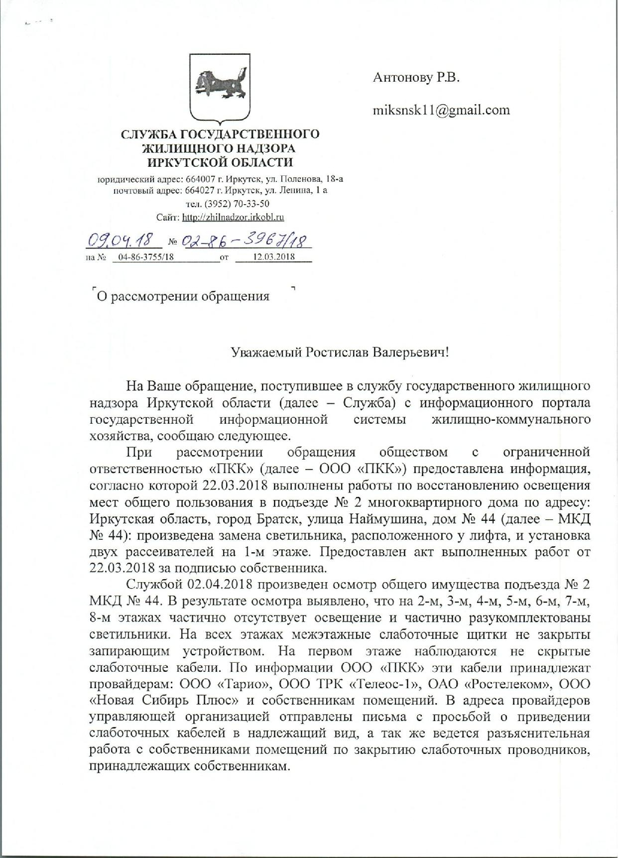 Номер жалобы:31413 Тип жалобы:Иные проблемы ЖКХ Название объекта: Регион:Иркутская область Город:Братск Адрес:улица Наймушина, 44 Описание жалобы:Во втором подъезде Наймушина 44 на первом этаже проводка не скрыта, у светильников нет плафонов Статус: