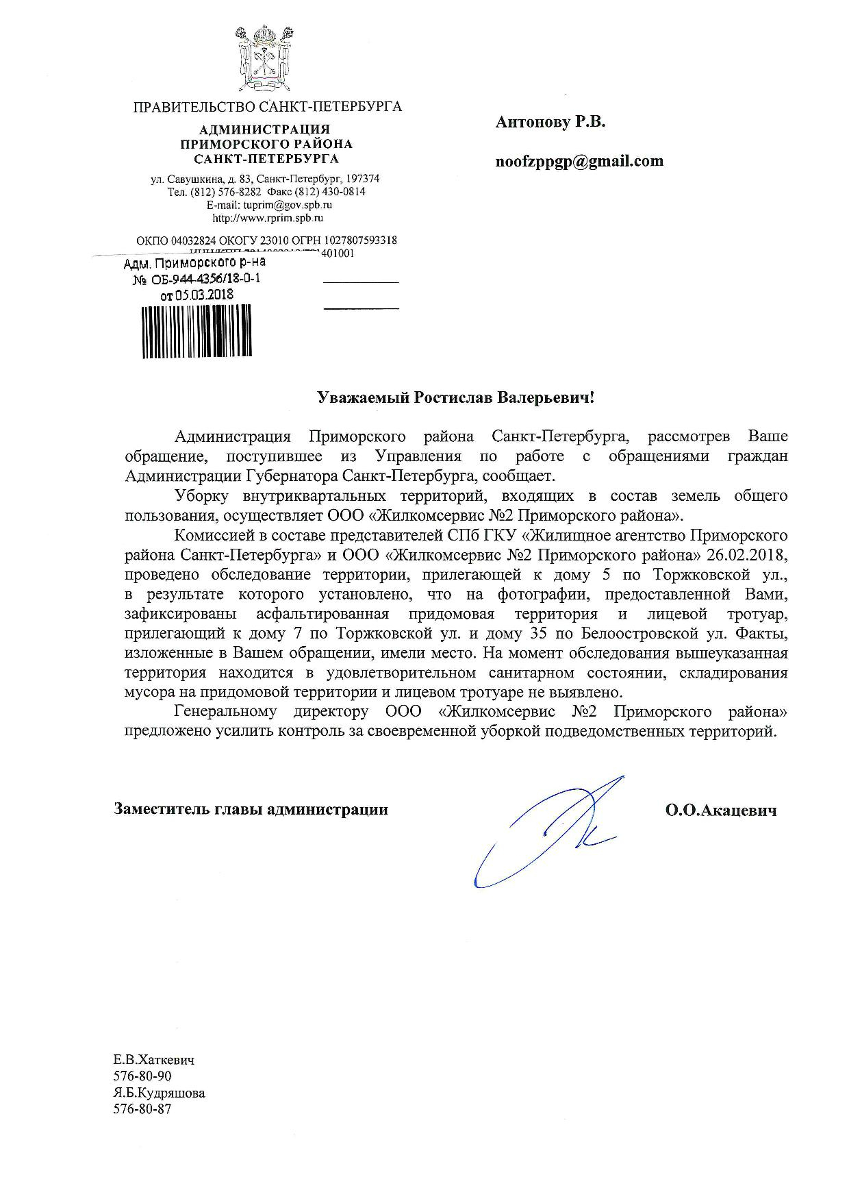 Номер жалобы:30045 Тип жалобы:Прочее Название объекта:Районная Администрация Город:Санкт-Петербург Адрес:Санкт-Петербург, Торжковская улица, 5 Описание жалобы:Мусор Статус: