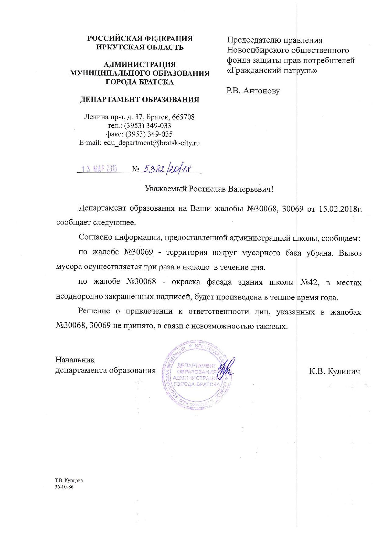 Номер жалобы:30069 Тип жалобы:Прочее Название объекта:Рпн Регион:Иркутская область Город:Братск Адрес:ул. Крупской, 39 Описание жалобы:Переполнены мусорные баки, нарушение СанПиН (школа 42) Статус: