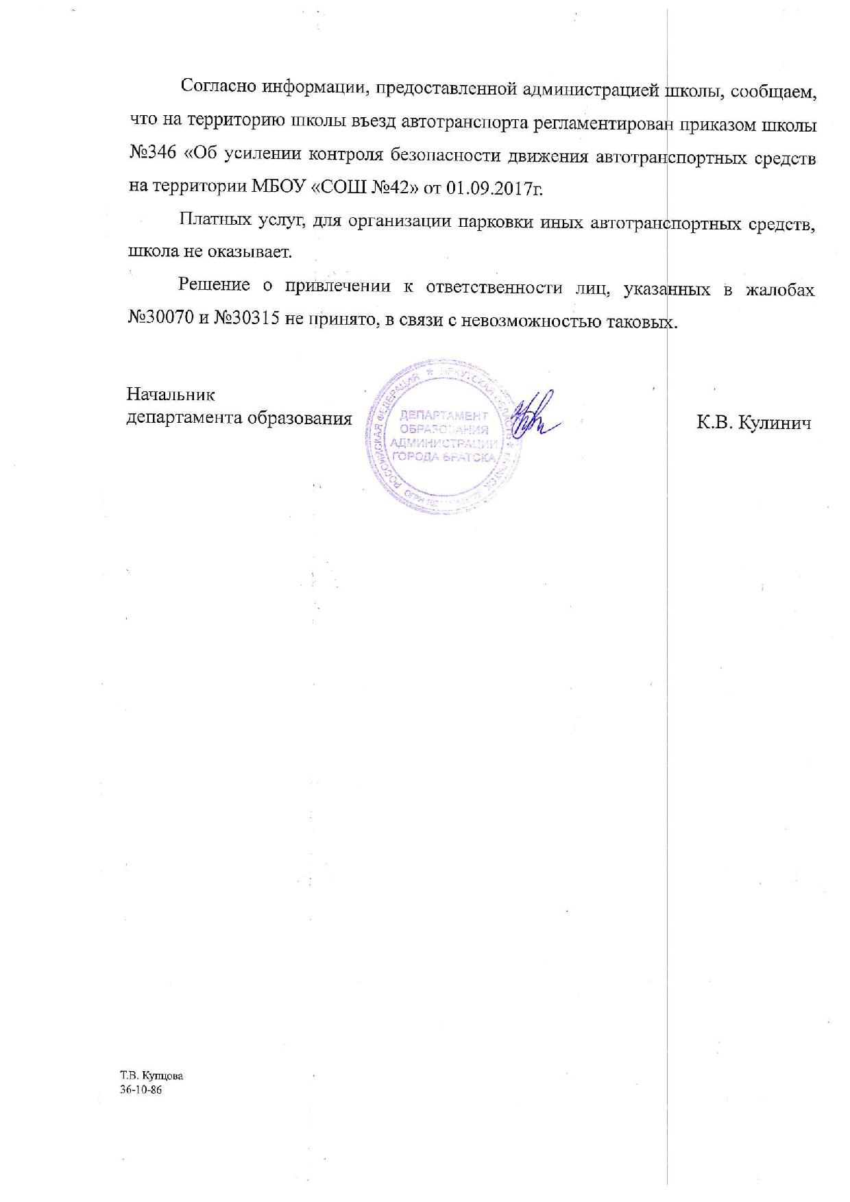 Номер жалобы:30070 Тип жалобы:Прочее Название объекта:Прокуратура, ФСБ Регион:Иркутская область Город:Братск Адрес:ул. Крупской, 39 Описание жалобы:Организация свободного проезда и парковки любого автотранспорта на территорию школы 42. Возможно, предоставление услуг платной охраняемой стоянки для жителей окрестных домов. Нарушение антитеррористического законодательства Статус: