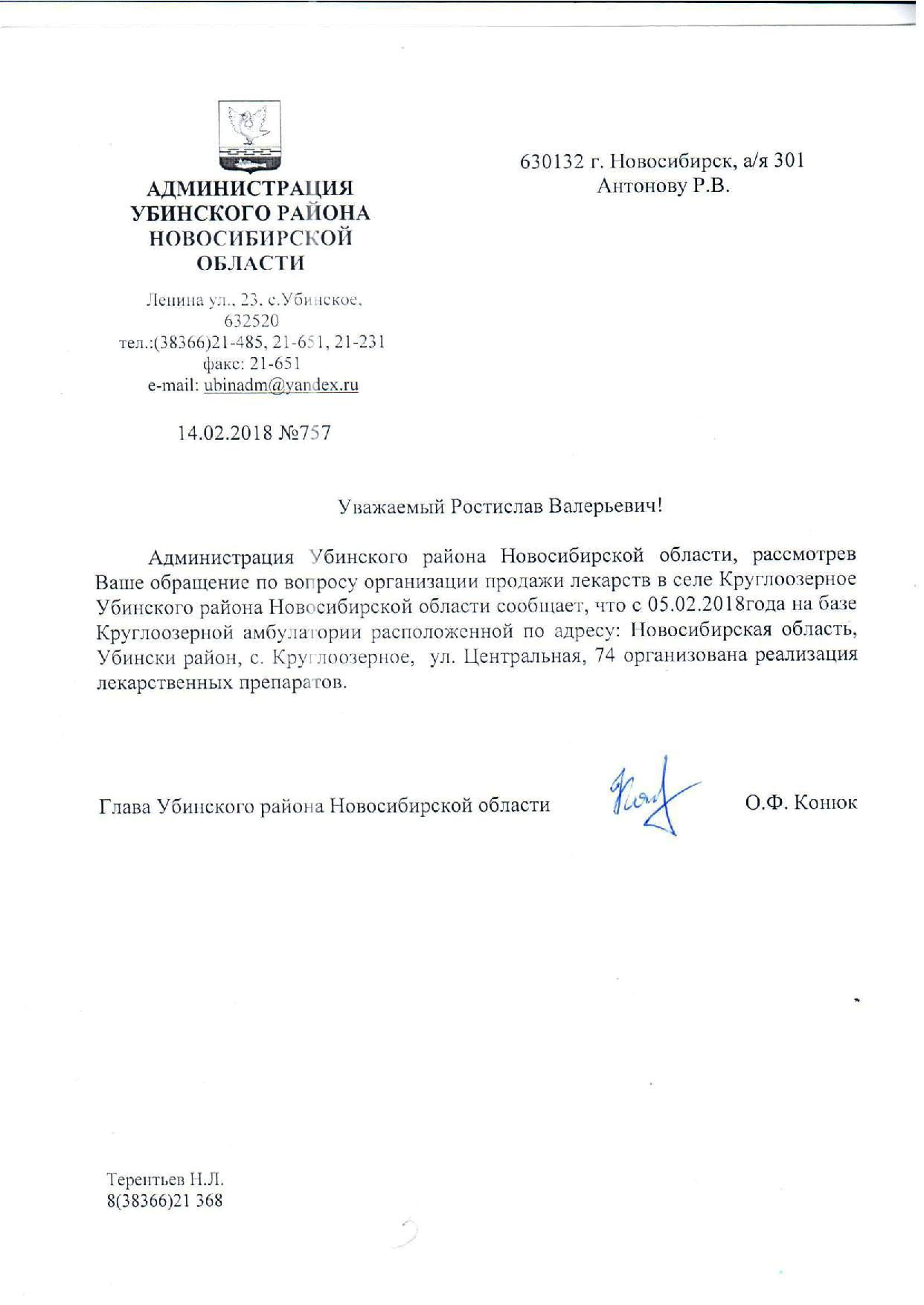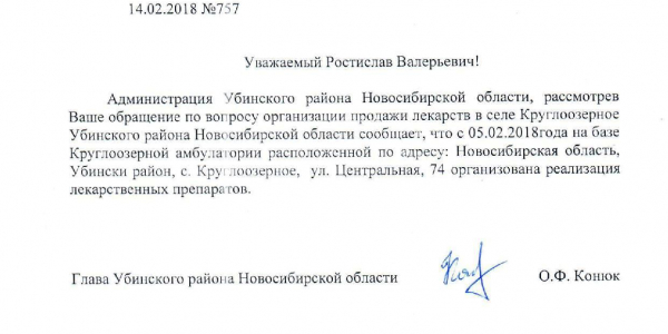 Номер жалобы:30072 Тип жалобы:Прочее Название объекта:Министерство Здравоохранения НСО Город:Новосибирск Адрес:Новосибирск, улица Сибирская, 33 Описание жалобы:В селе Круглоозерном Убинского района Новосибирской области закрыли аптечный пункт ОАО «Фармация». По обещанию министра здравоохранения, продажу лекарств должны были организовать на базе структурной единицы Убинской ЦРБ - в местной амбулатории. Однако поручение министра не исполнено, продажа лекарств не организована. Статус: