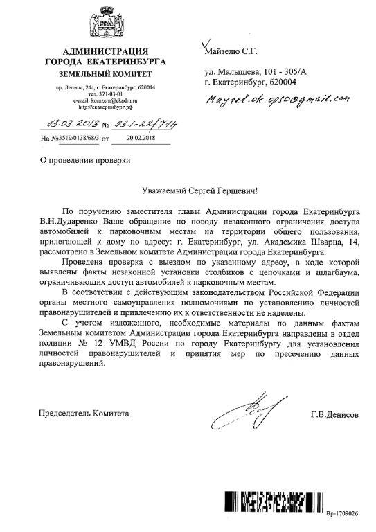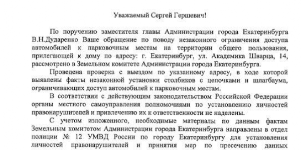 Номер жалобы:30214 Тип жалобы:Прочее Название объекта:Администрация Екатеринбурга Регион:Свердловская область Город:Екатеринбург Адрес:ул. Академика Шварца, 14 Описание жалобы:Не законно захват газона для парковке транспортных средств в добавок застолблен. Прошу освободить газон от транспортных средств. Статус: