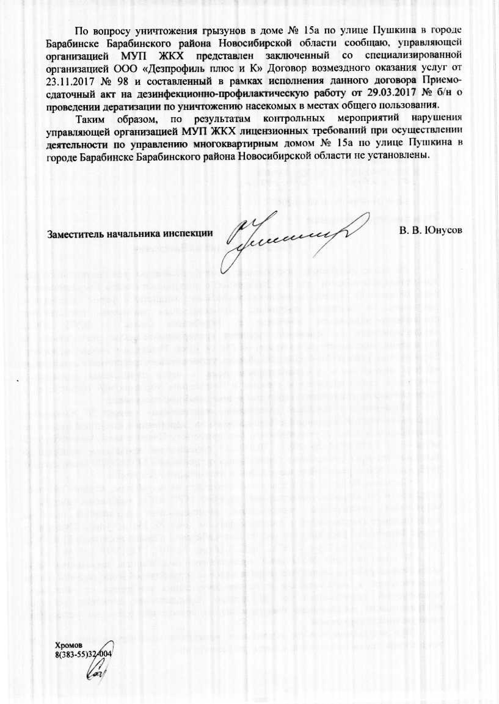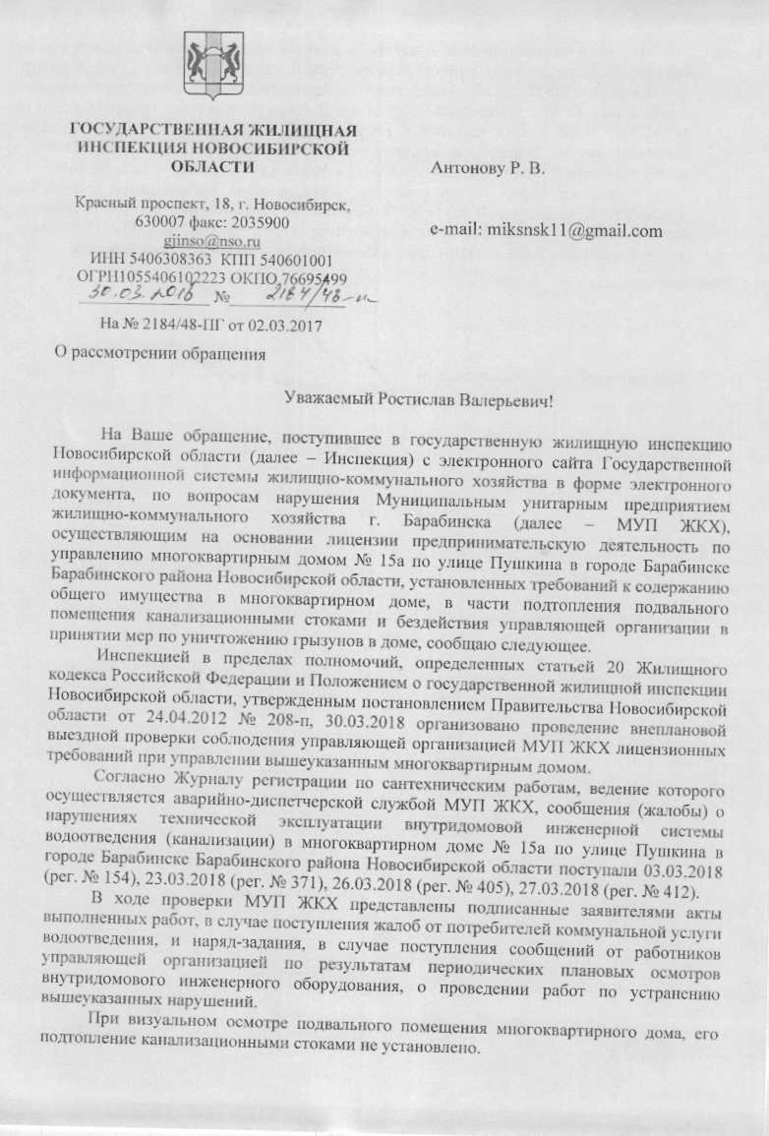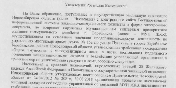 Номер жалобы:31333 Тип жалобы:Иные проблемы ЖКХ Название объекта:Муп ЖКХ Регион:Новосибирская область Город:Барабинск Адрес:ул. Пушкина, 15а Описание жалобы:В подъезде √ 3 воняет канализацией, бегают крысы, все окна замерзшие из-за влажности, состояние подъезда как в Припяди(Чернобыль) Статус: